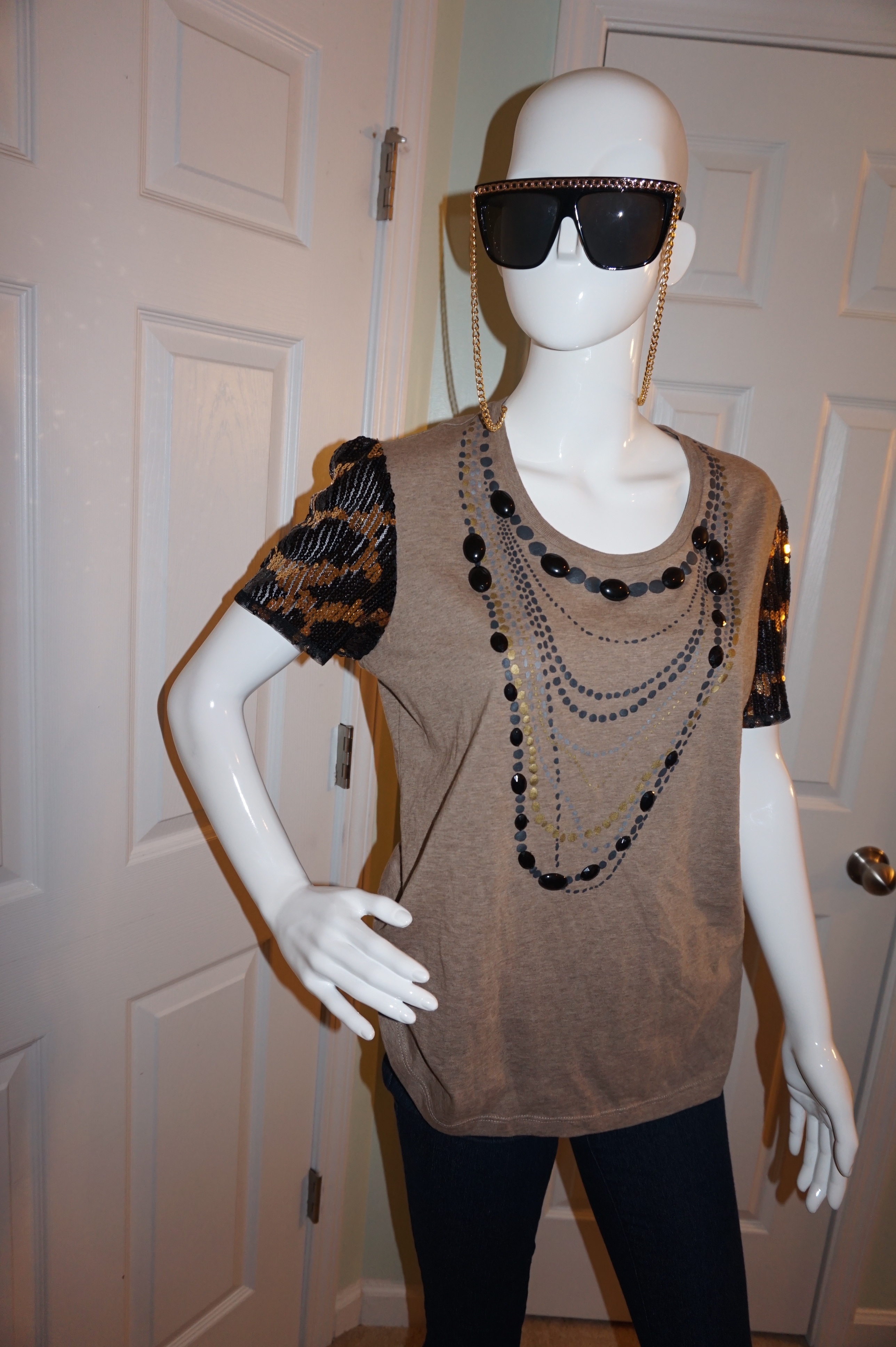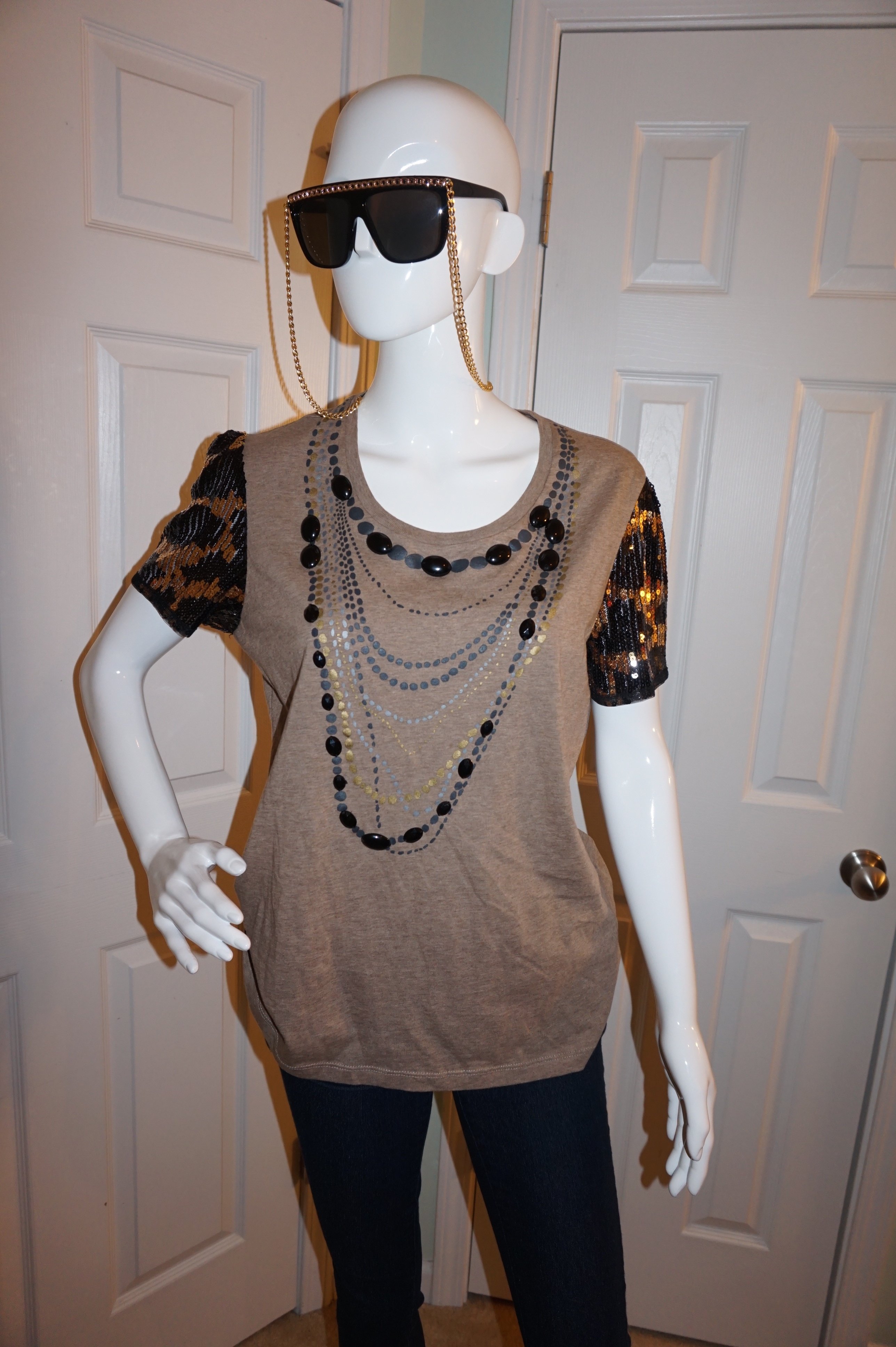 Up for sale is a lovely Rebella Moses Brown Black Necklace Top Size L. The material is cotton and it does not have shoulder pads. The measurements are pit to pit 22", and the overall length is 26" long.