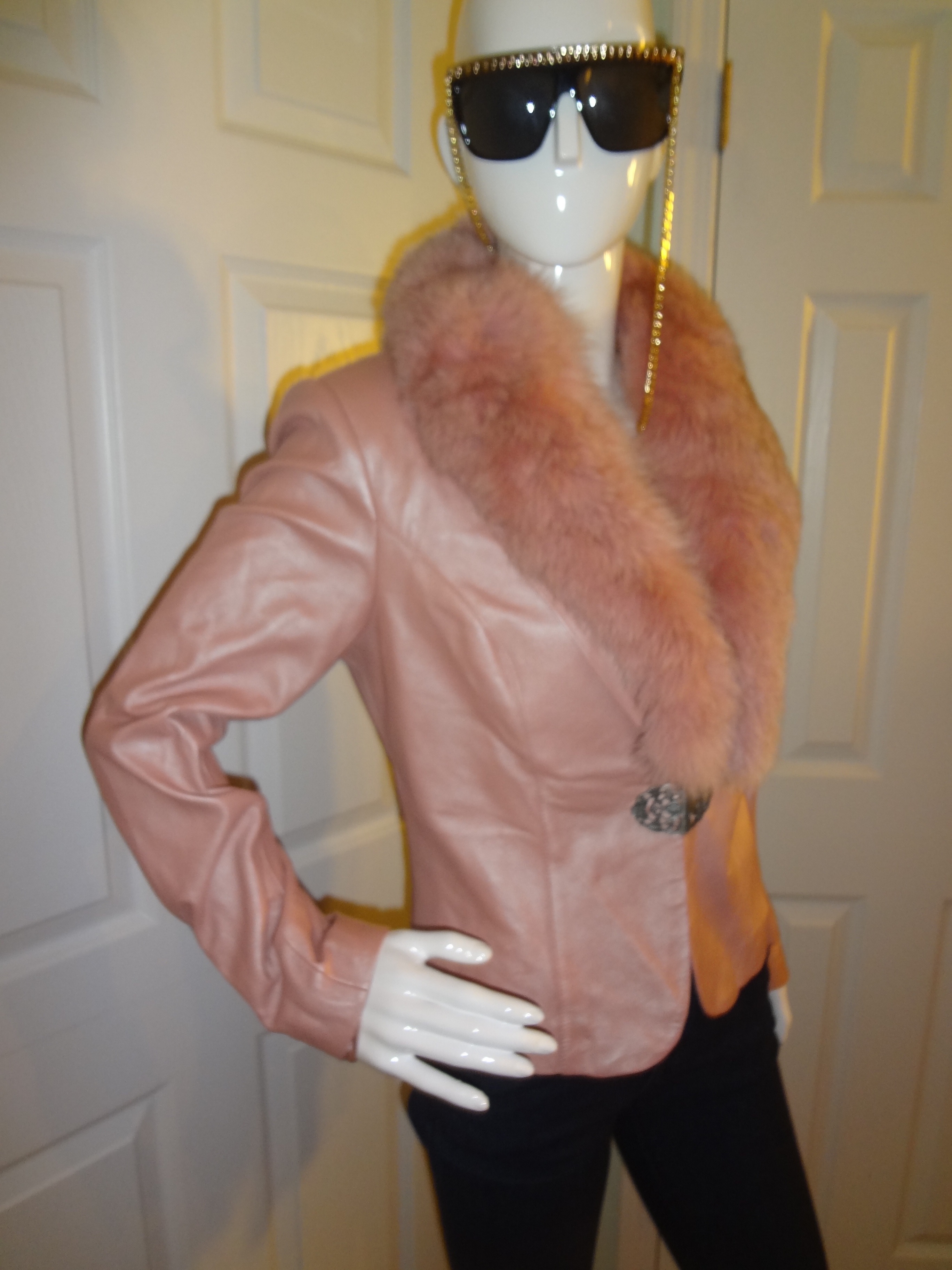Up for sale is a lovely Vintage Peter Nygard Pink Leather Fox Fur Coat Size S-M. The material is leather and it does have shoulder pads. The measurements are pit to pit 18", sleeve 17", and the overall length is 21" long.