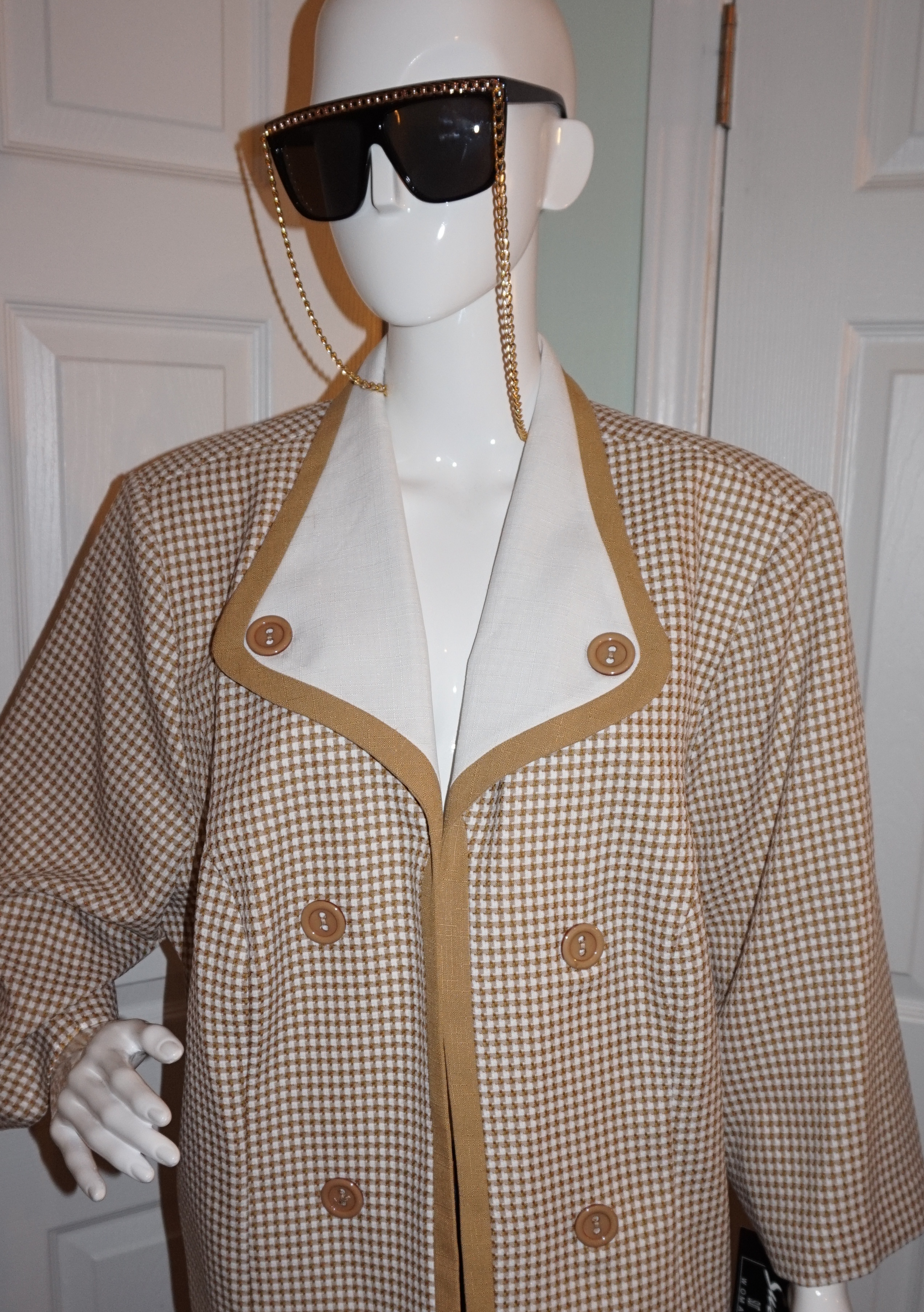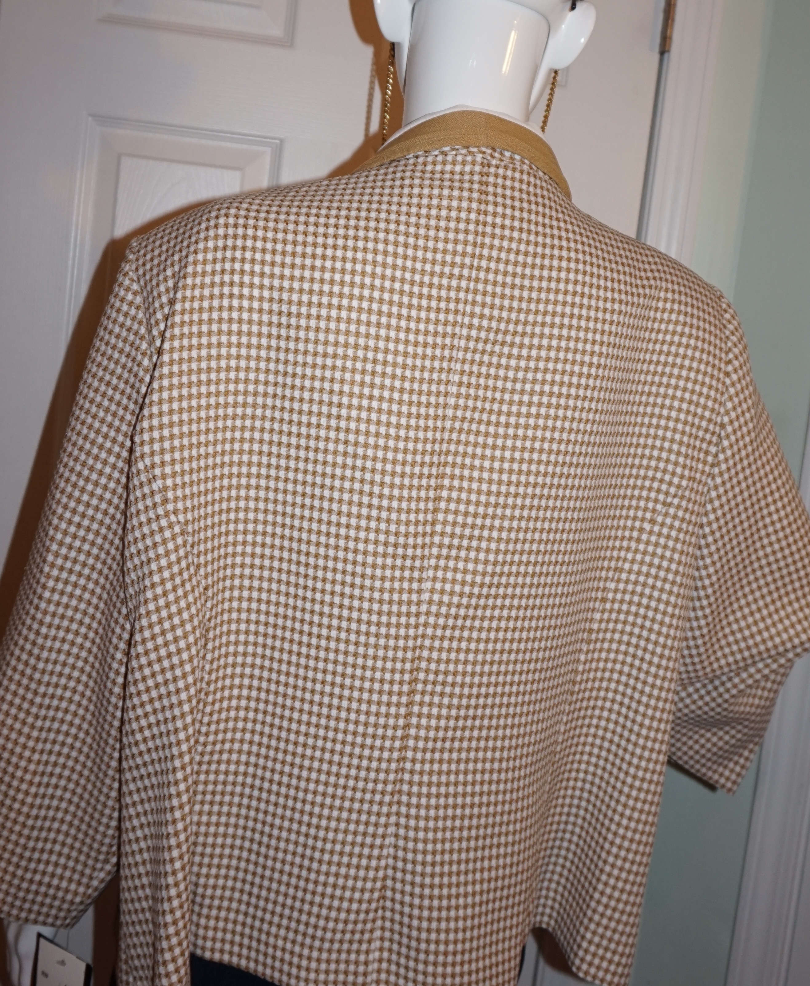 Up for sale is a lovely Vintage Sunset Woman Tan/White Jacket/Top Size 3x. The material is polyester and it does have shoulder pads. The measurements are pit to pit 26", sleeve 11", and the overall length is 24" long.