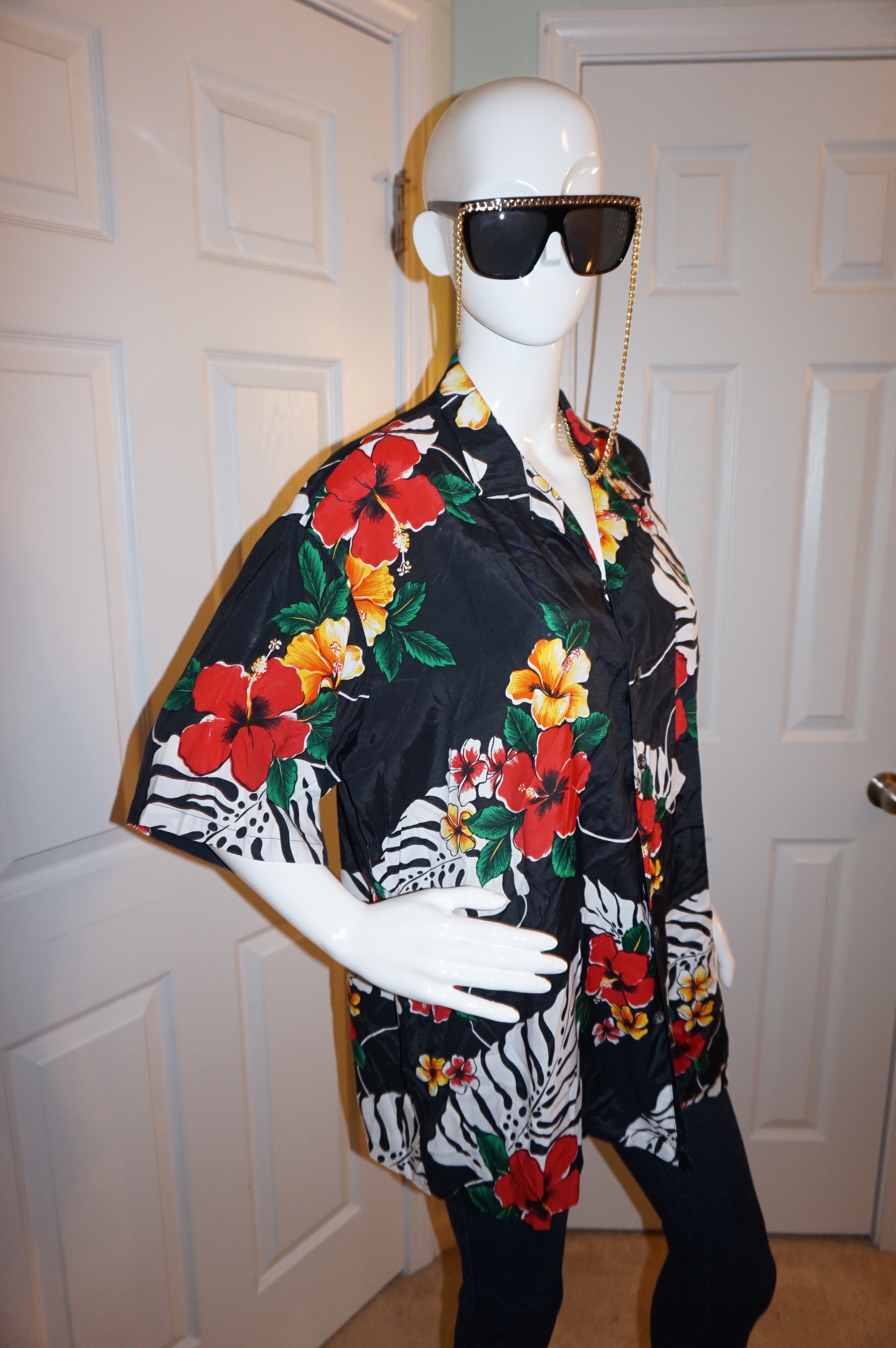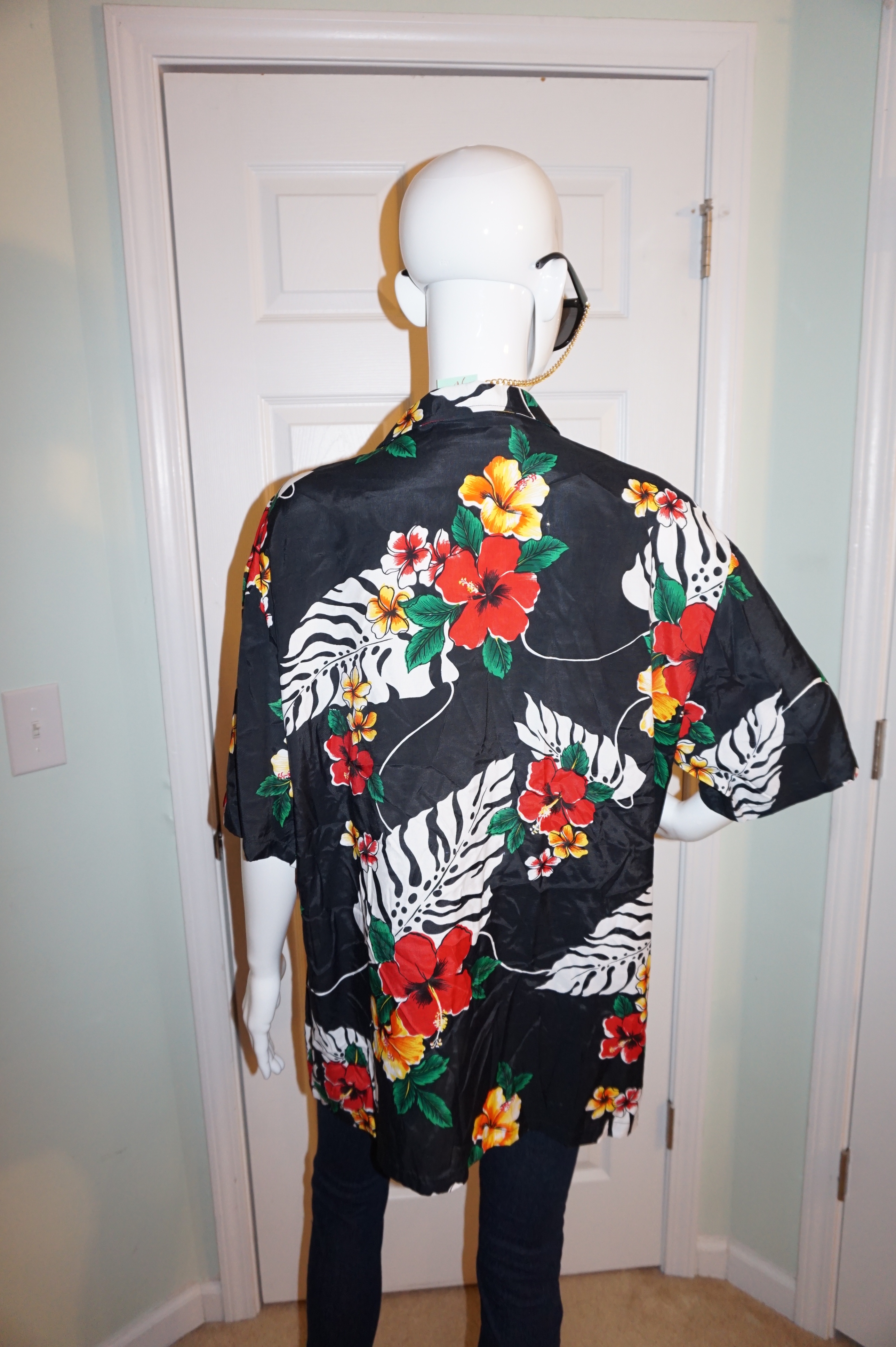 Up for sale is a lovely Vintage Chemise Black Hawaiian Shirt Size 2x. The material is rayon and it does not have shoulder pads. The measurements are pit to pit 25", and the overall length is 30" long.