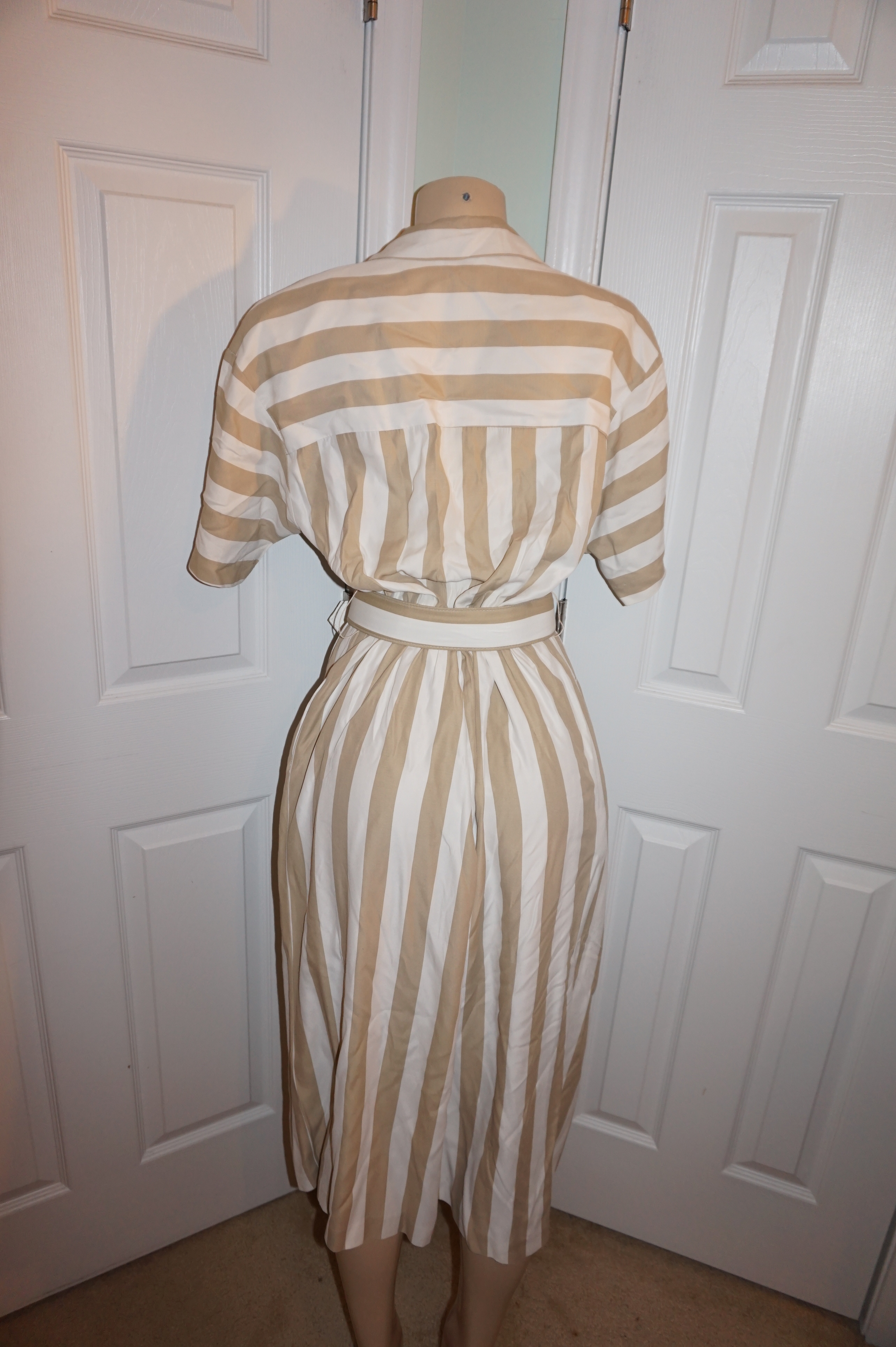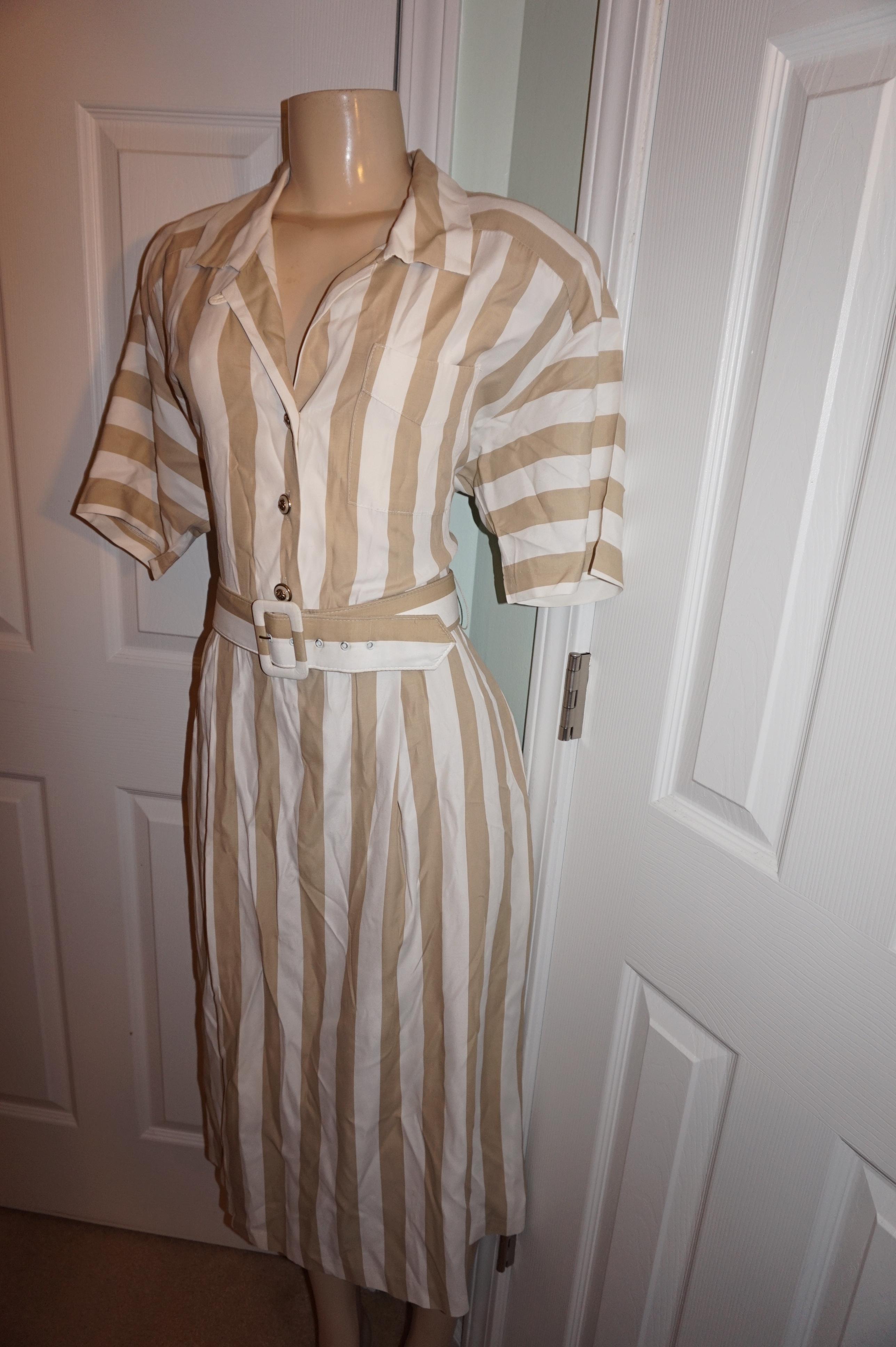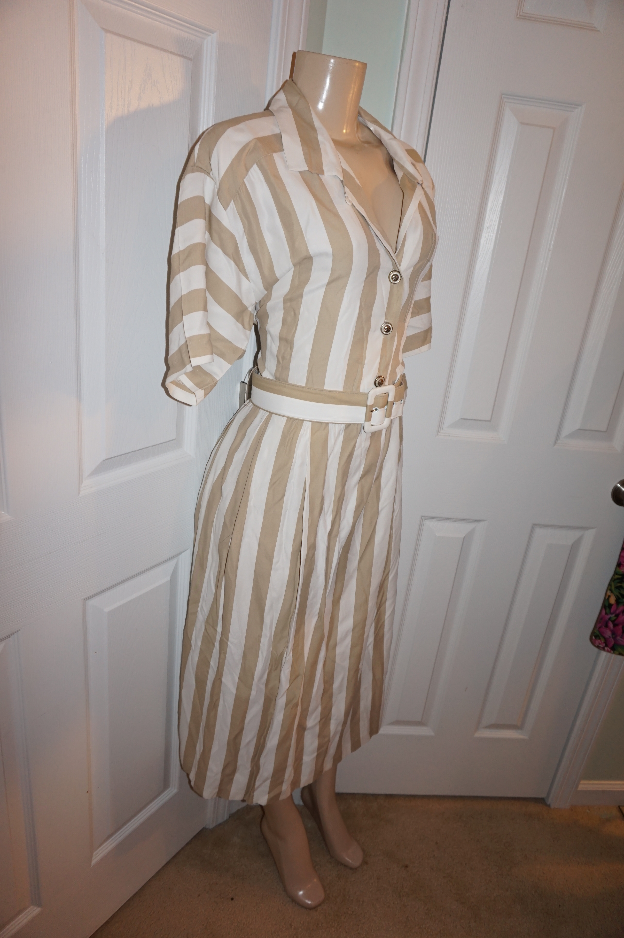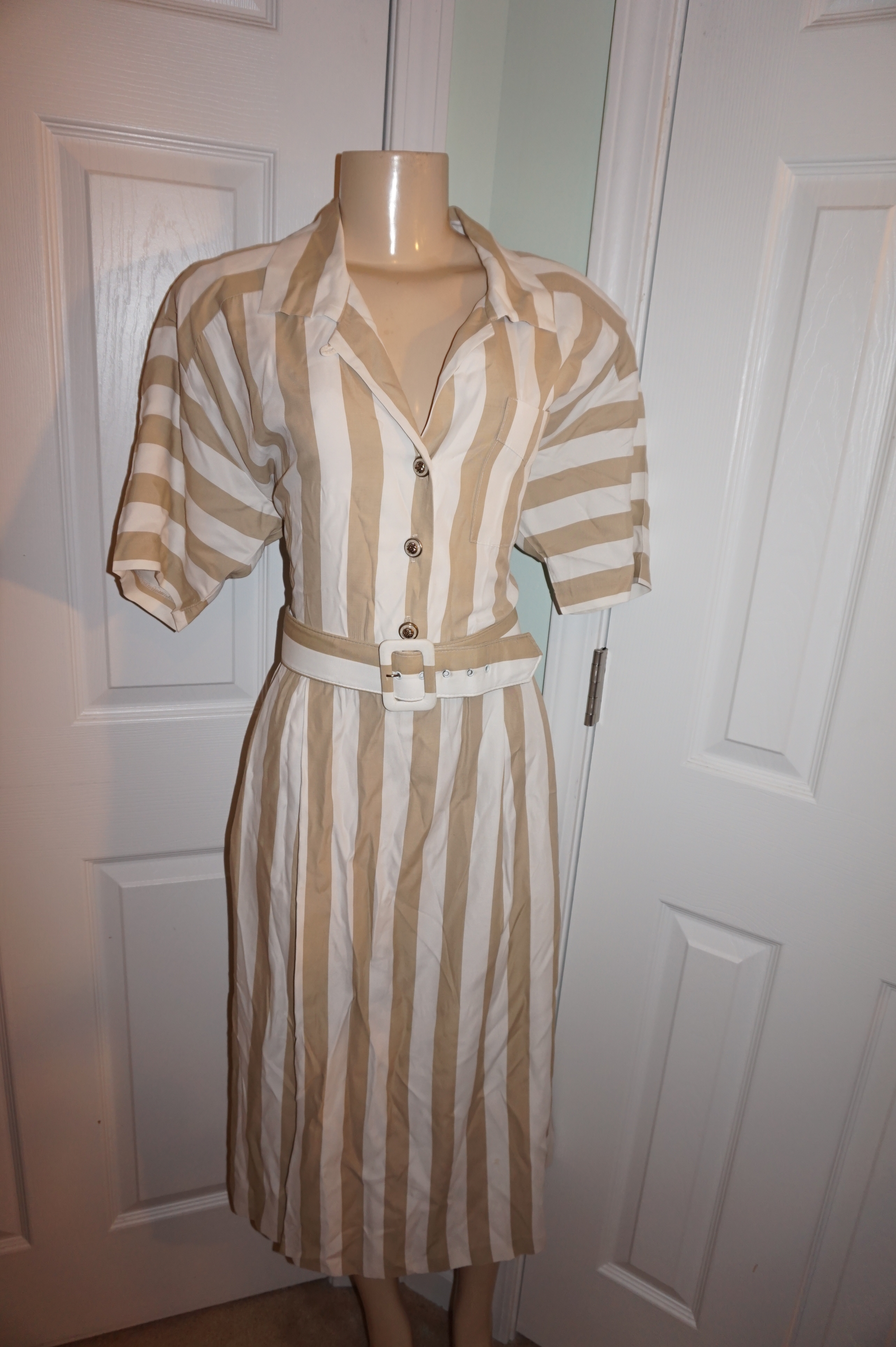 Up for sale is a lovely Vintage BGB Tan/White Stripe Dress Size XL. The material is rayon and it does have shoulder pads. It comes with a removable belt. The measurements are pit to pit 21", and the overall length is 50" long.