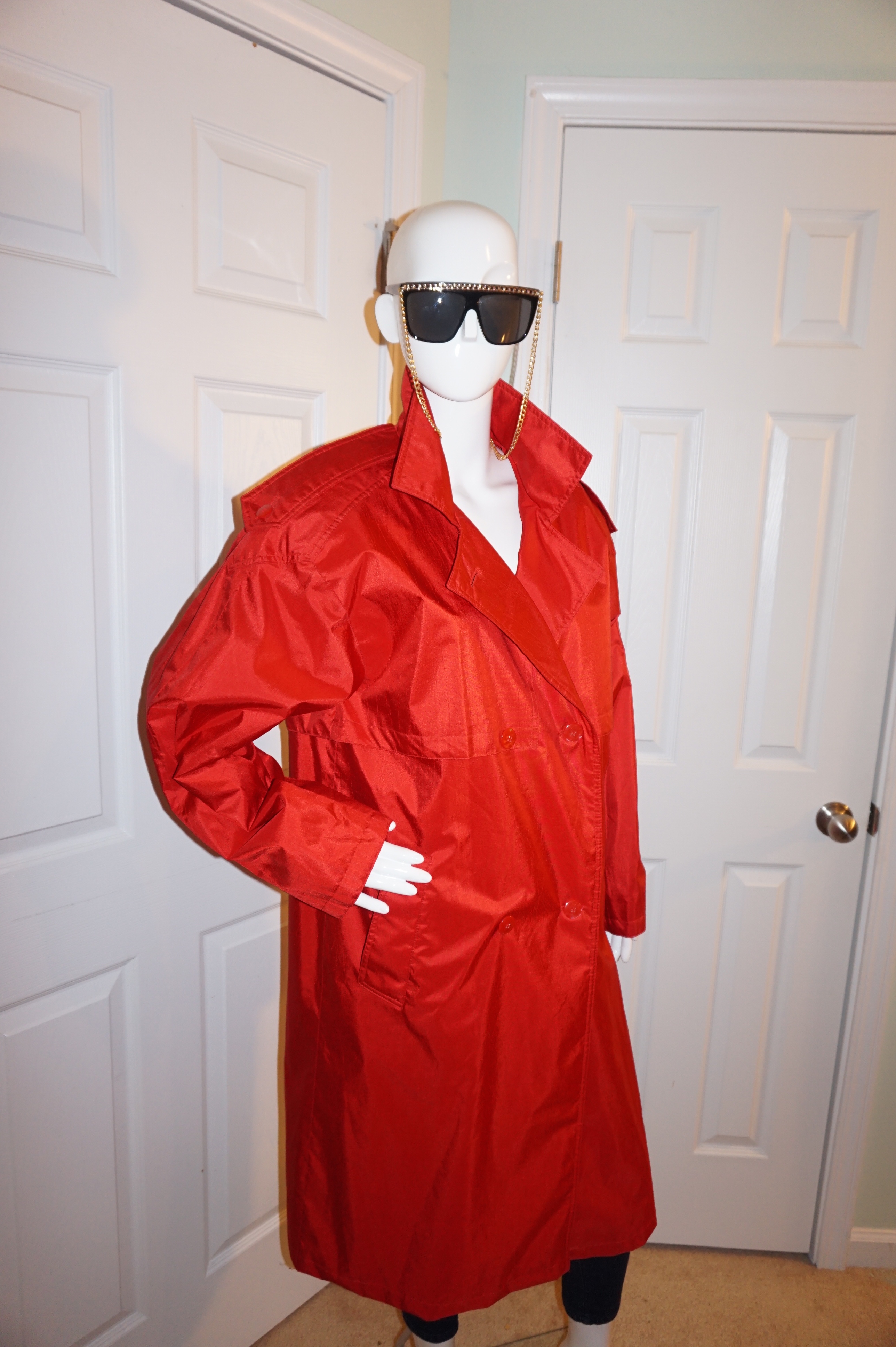 Up for sale is a lovely Vintage Red Long Trench Coat Size 1x. The material is polyester and it does have shoulder pads. The measurements are pit to pit 20", sleeve 21", and overall length is 44" long.
