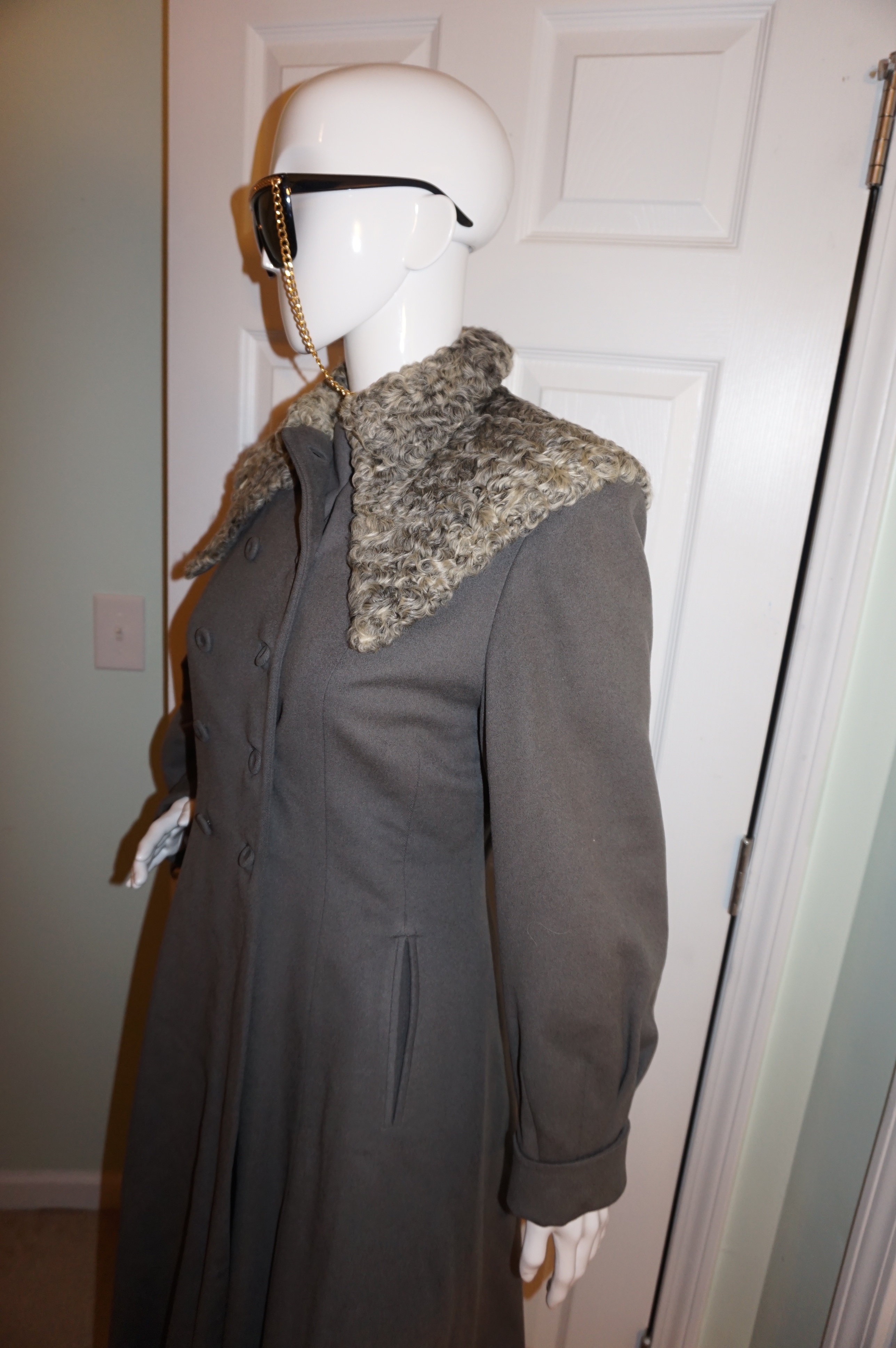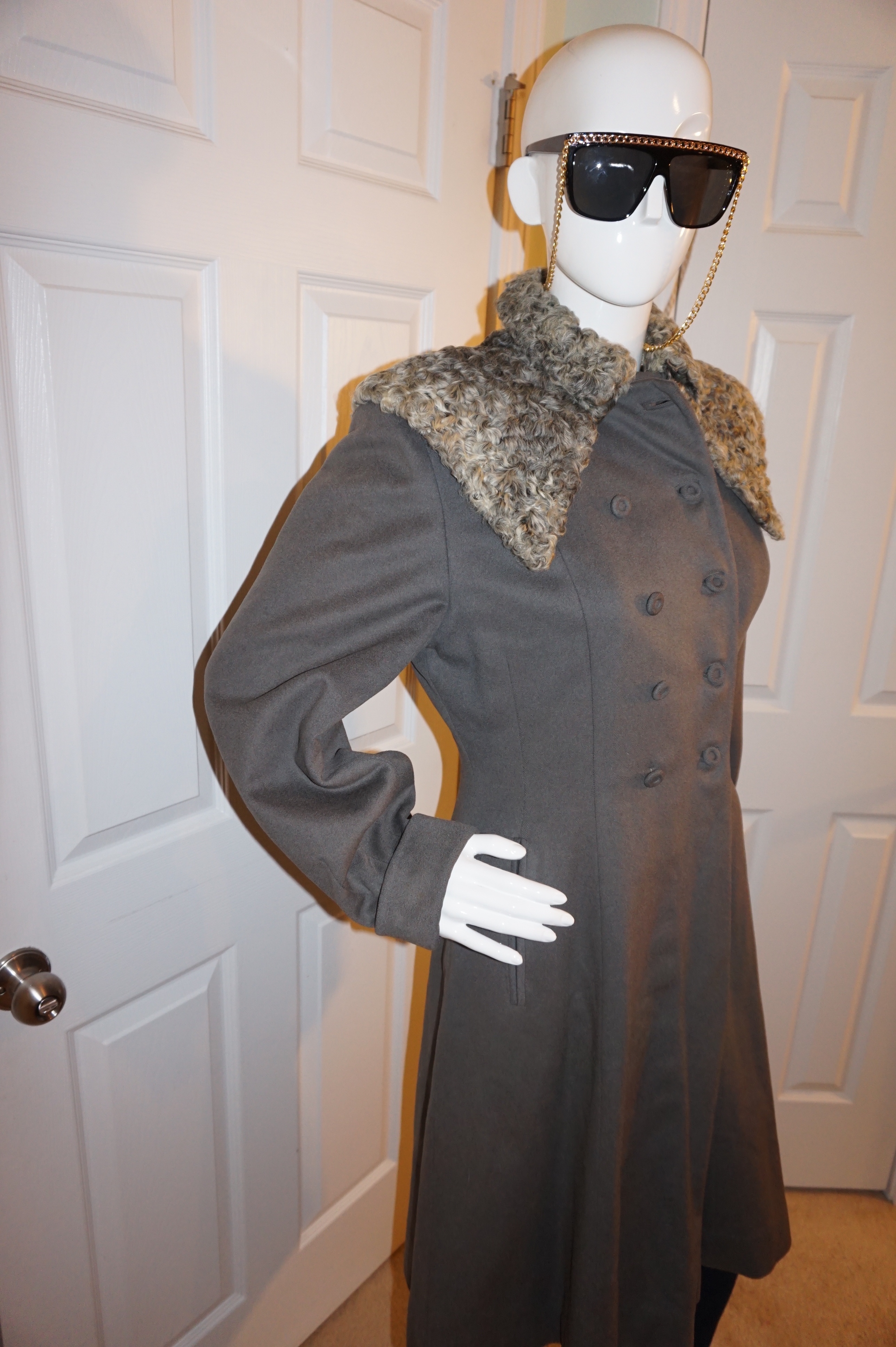 Up for sale is a lovely Vintage Gray Wool Coat with Curly Lamb Collar Size S-M. The material is wool and the collar is curly lamb hair. The measurements are pit to pit 17", sleeve 17", and the overall length is 42" long.
