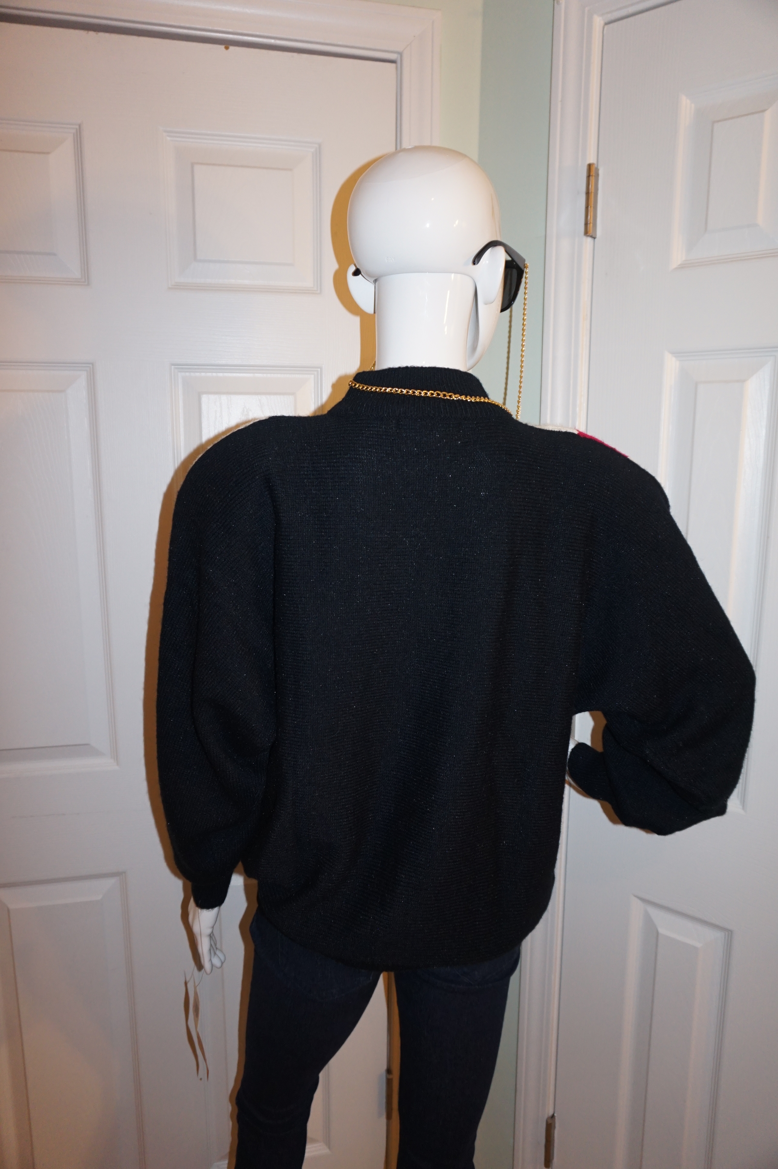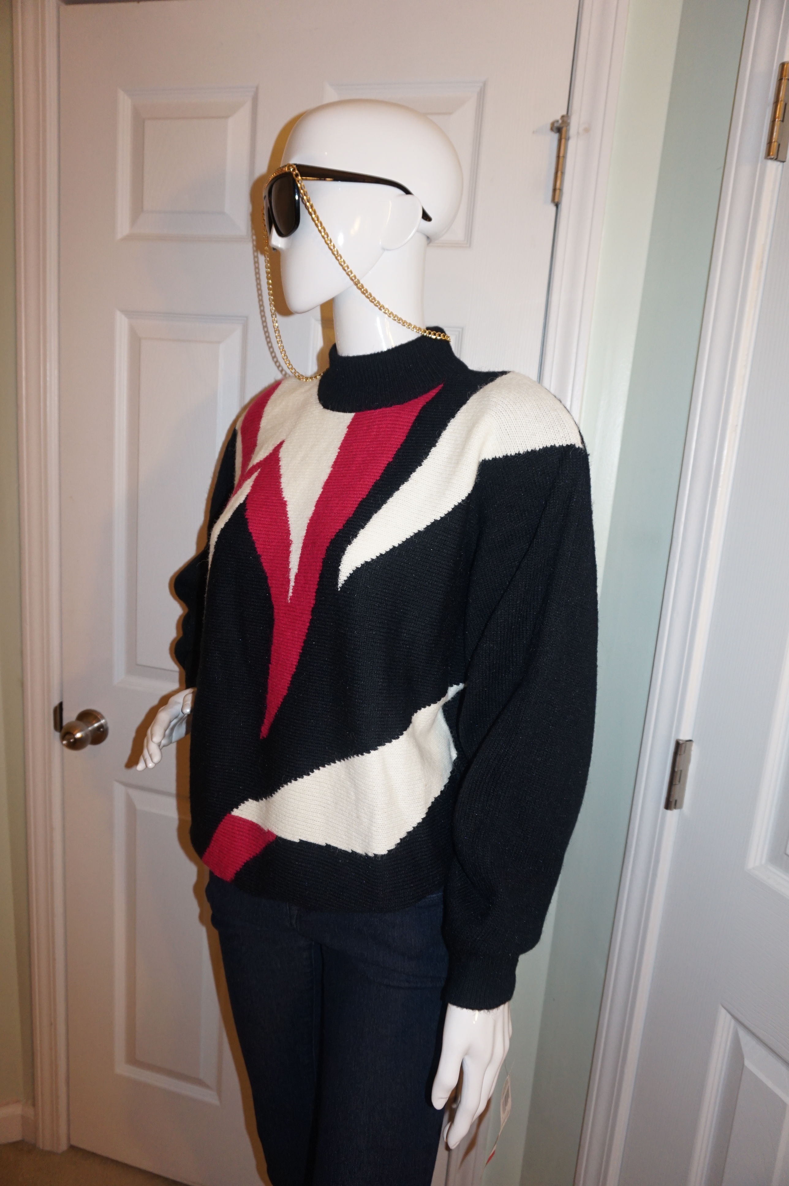 Up for sale is a lovely Vintage Alfred Dunner Black/White Pink Sweater Size XL. The material is acrylic and it does have shoulder pads. The measurements are pit to pit 24", sleeve 22", and the overall length is 27" long.