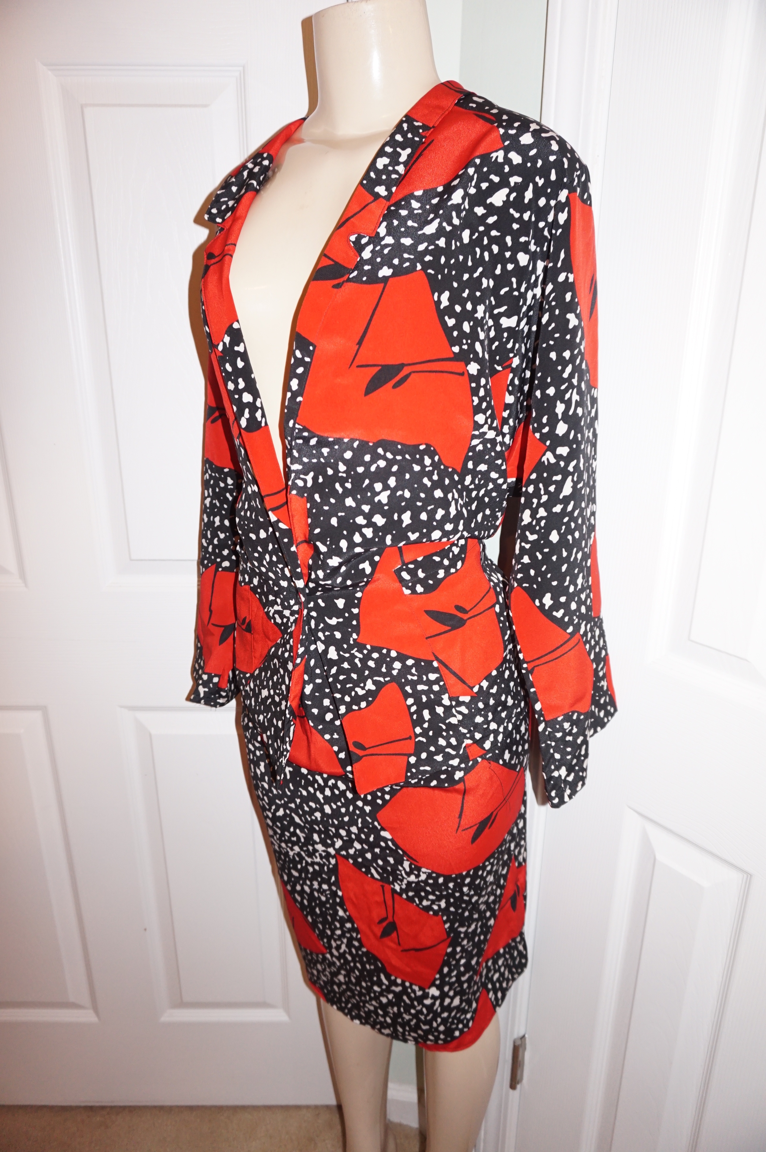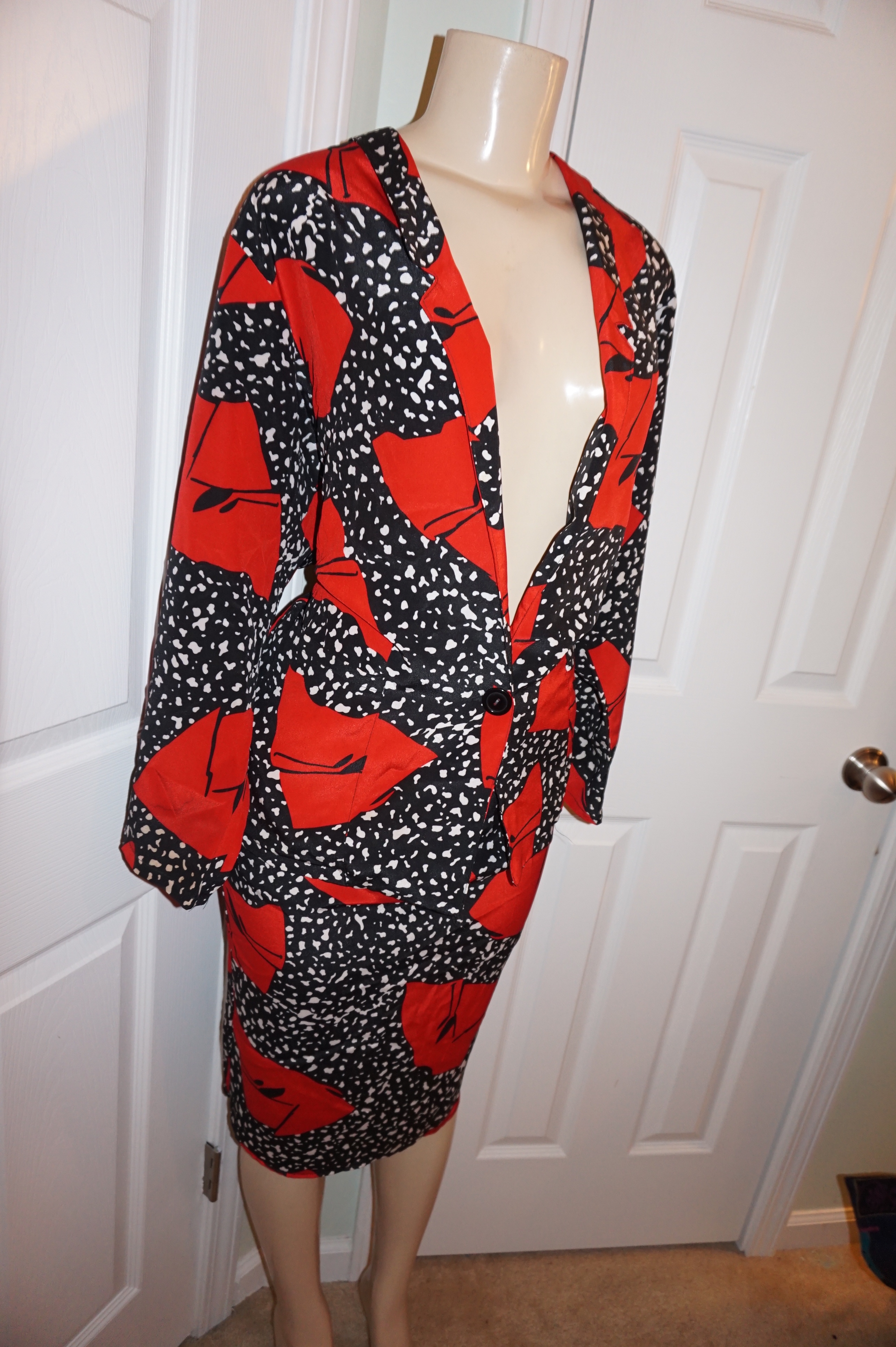 Up for sale is a lovely Vintage Vickie 2 Piece Black/Red Skirt Set Size L-XL. The material is polyester and it does not have shoulder pads. The measurements for the blazer are pit to pit 20", sleeve 17", and the overall length is 28" long. The skirt measurements are waist which has little stretch between 15"-20" and the overall length is 29" long.