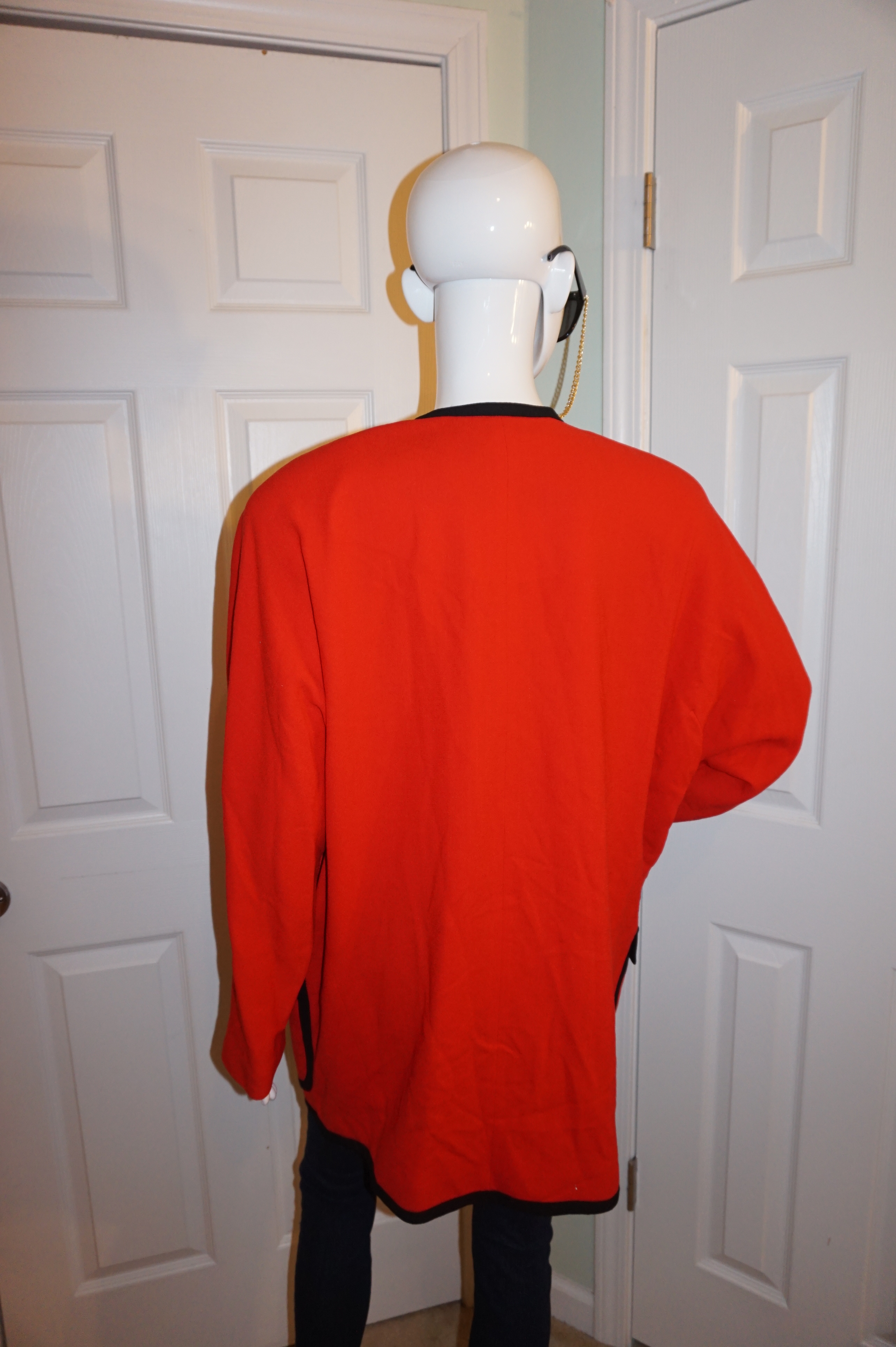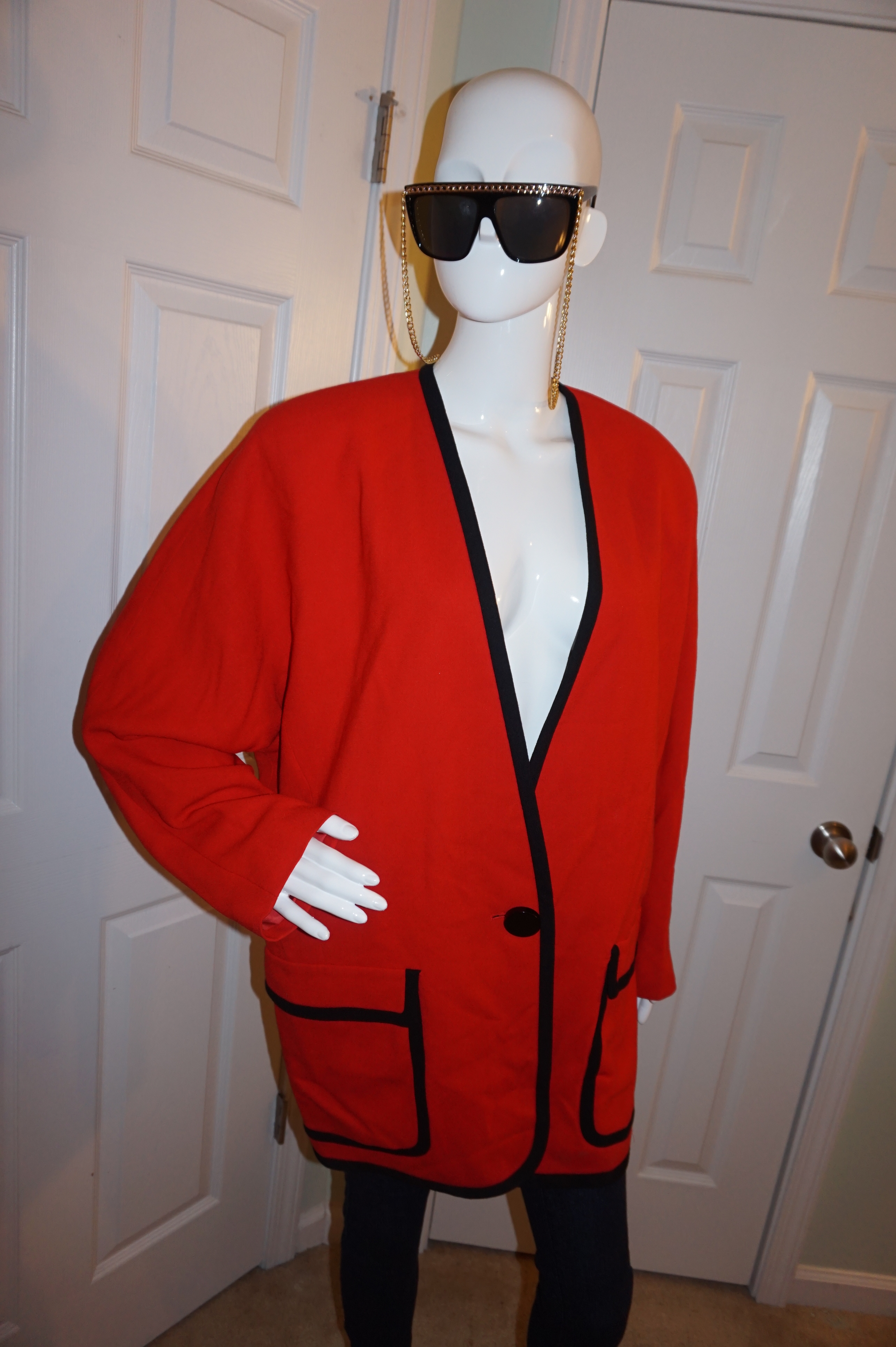 Up for sale is lovely Vintage Ellen Tracy Red/Black Trim Blazer Size 1x. The material is wool and it does have shoulder pads. The measurements are pit to pit 26", sleeve 15", and the overall length is 33" long.