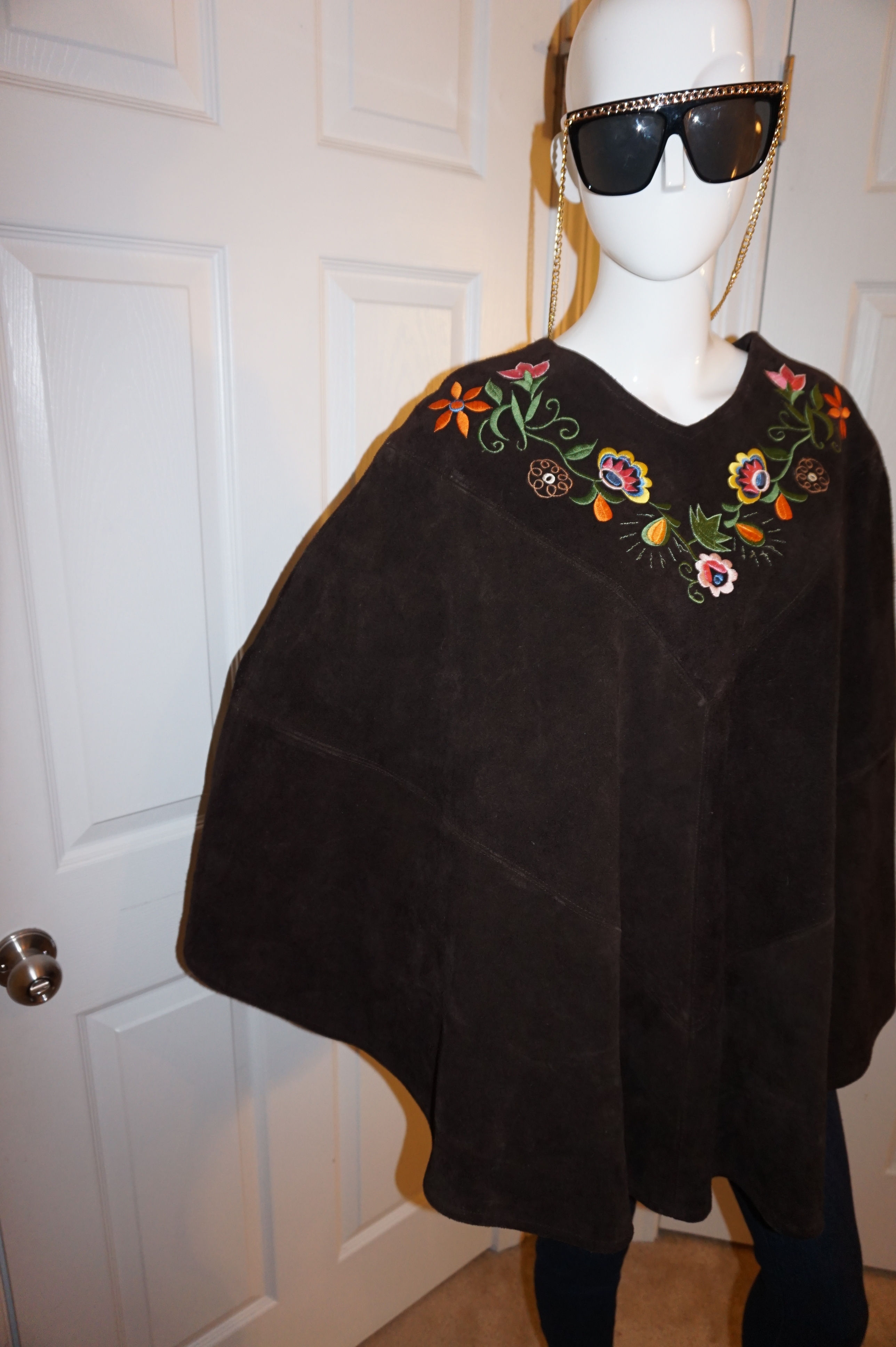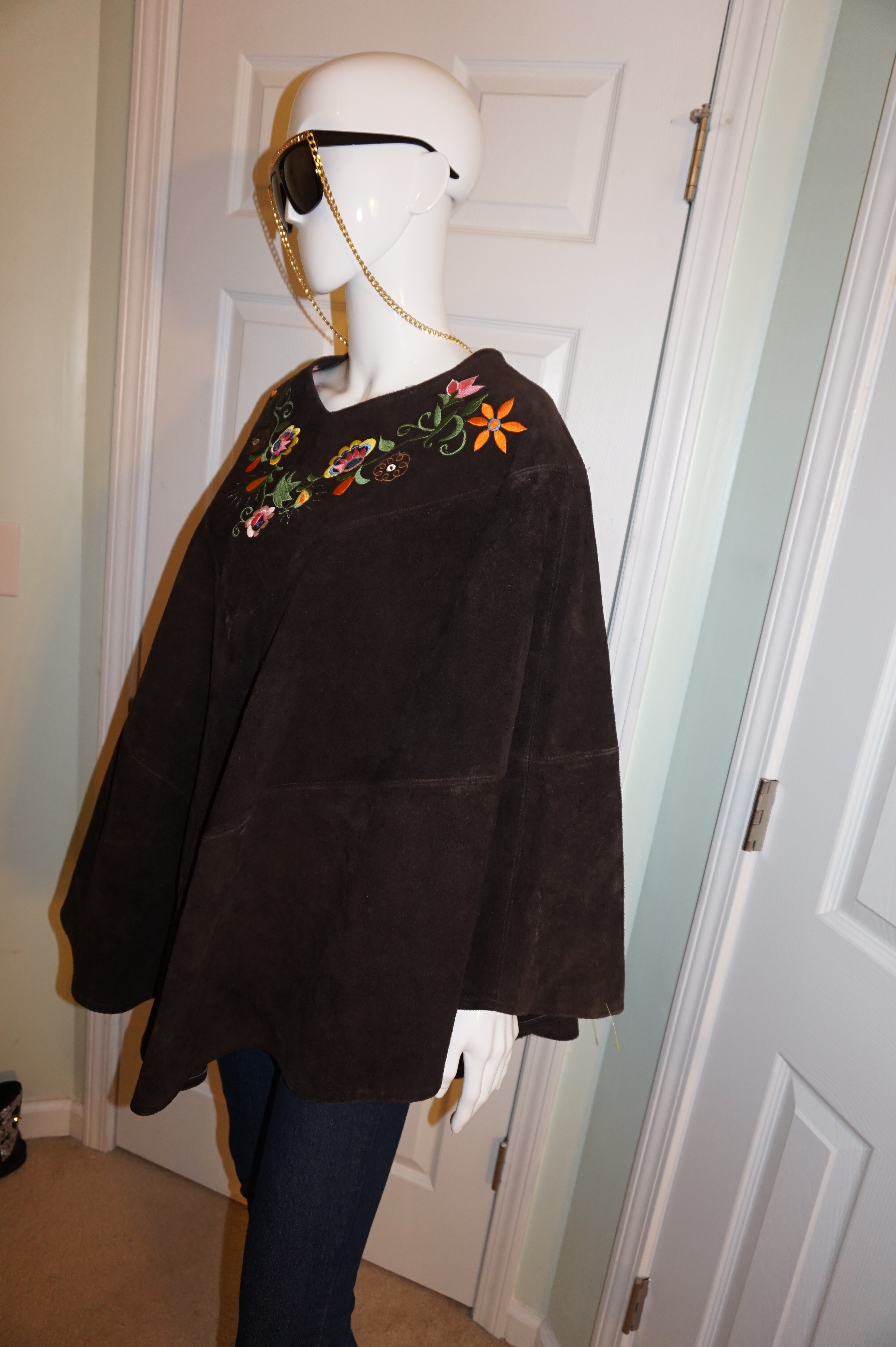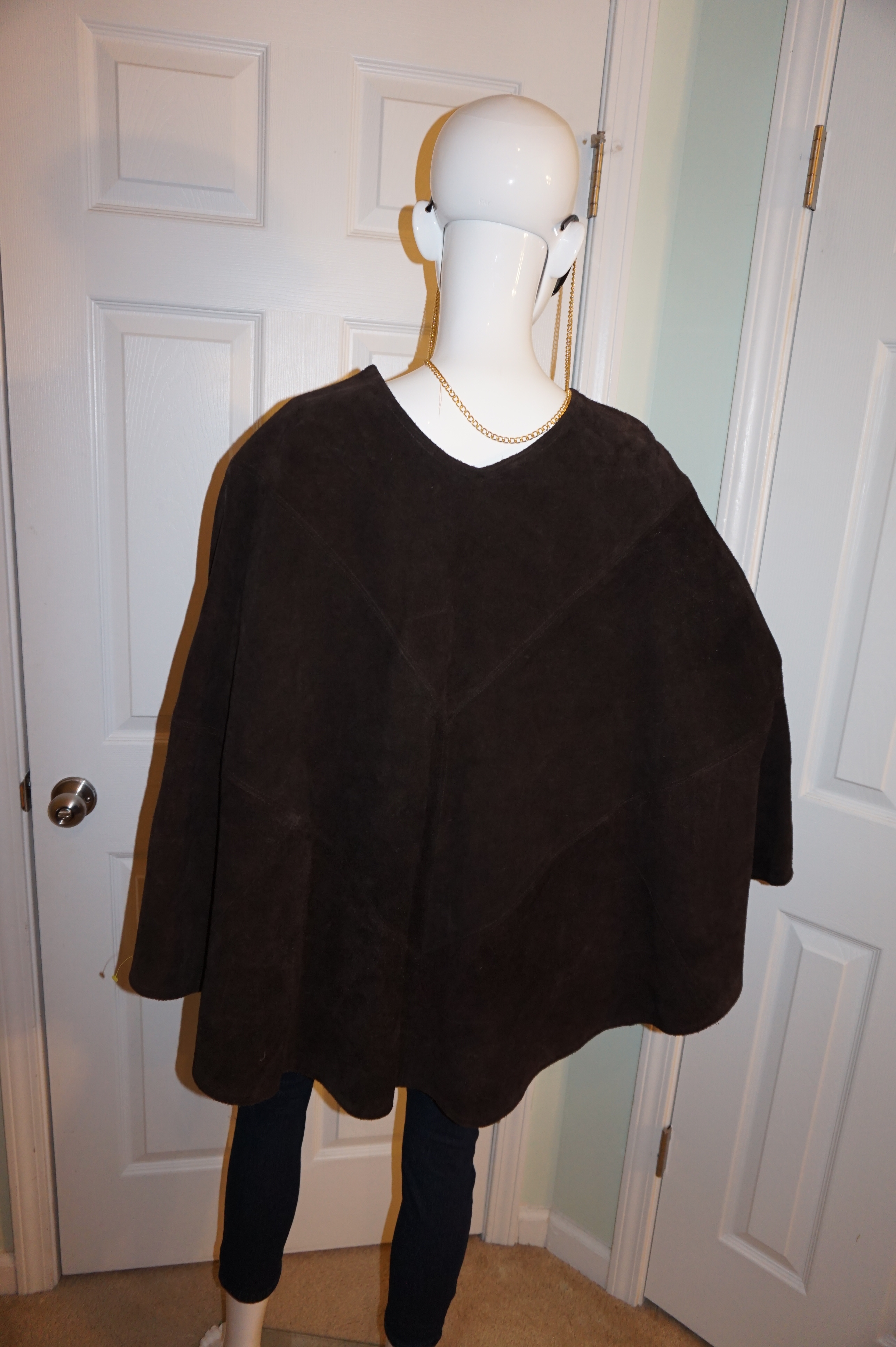 Up for sale is a lovely Vintage Brown Suede Heavy Brown Cape Size L-2x. The material is suede/leather and it does not have shoulder pads. The measurements are pit to pit 48", and the overall length is 33" long.