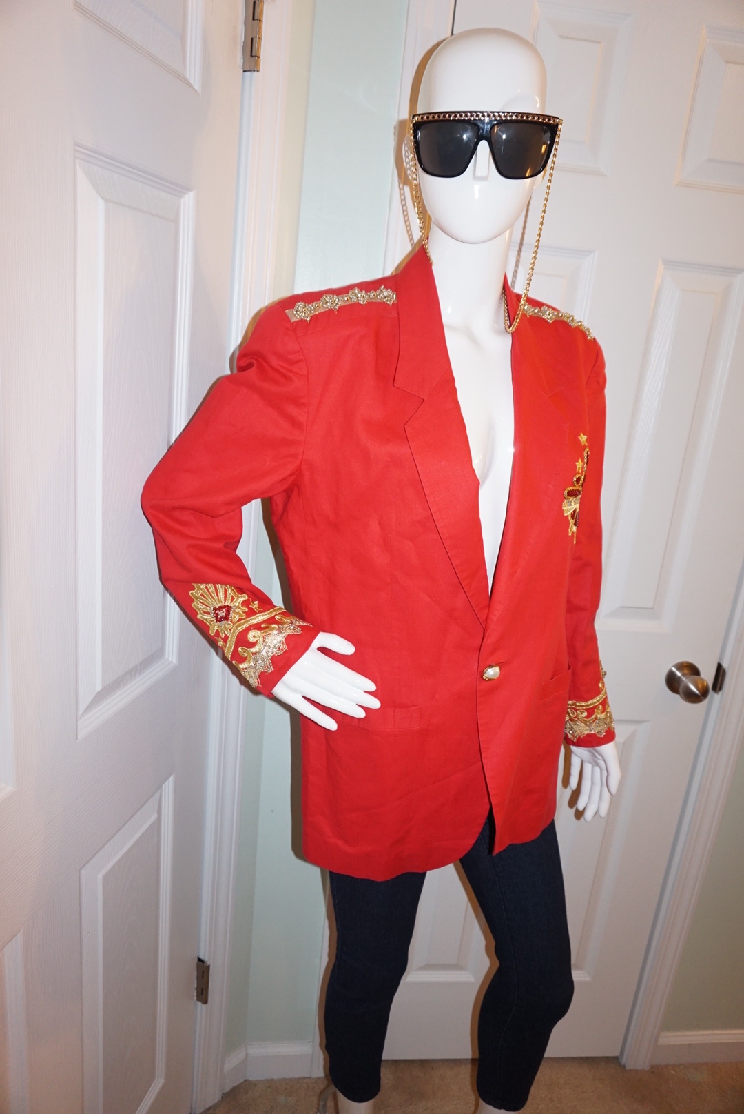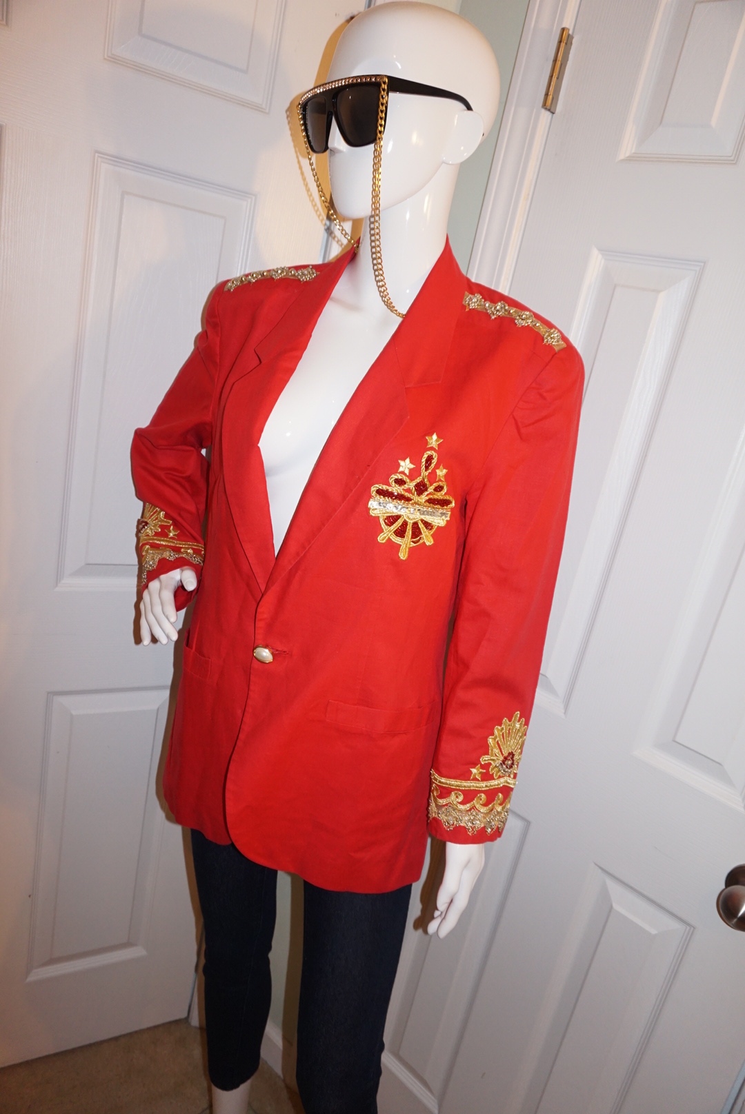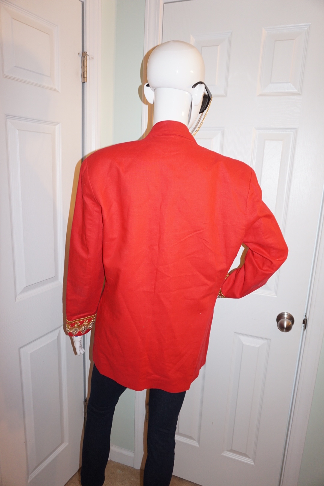 Up for sale is a lovely Vintage Cedars Red/Gold Blazer Size L.The material is ramie and it does have shoulder pads. The measurements are pit to pit 21", sleeve 15", and the overall length is 29" long.