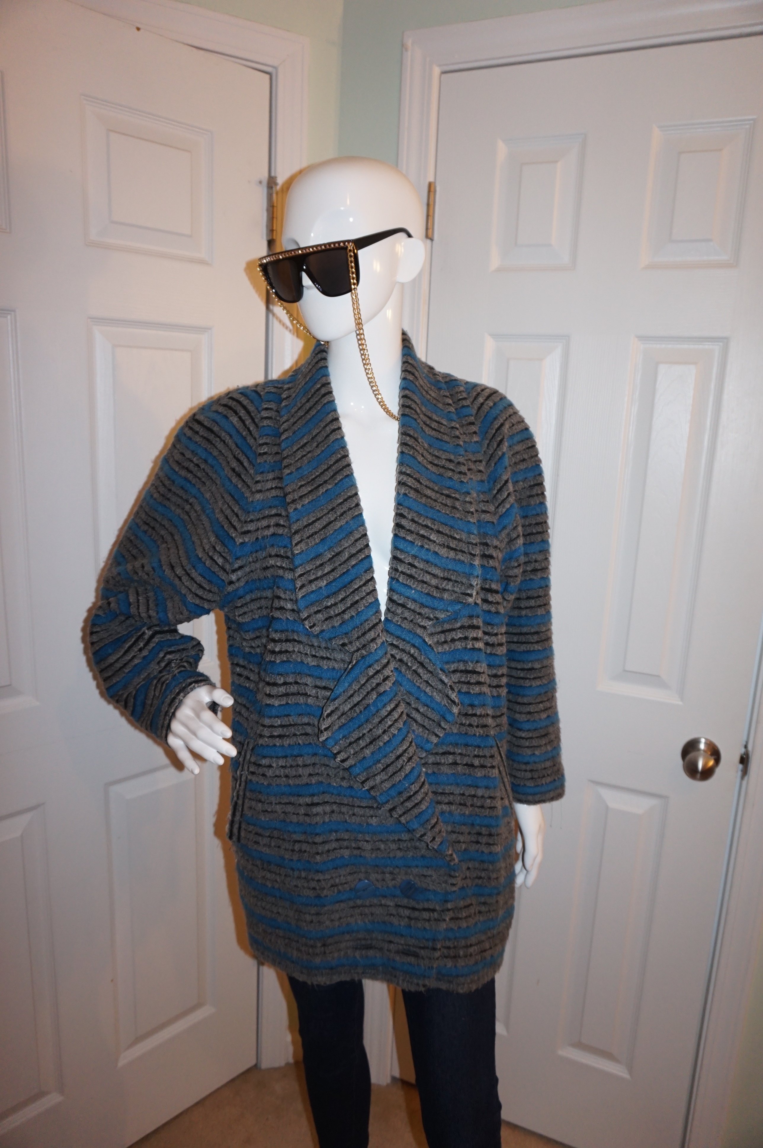 Up for sale is a lovely Vintage Ami Coat Gray/Blue Coat Size XL. The material is wool and it does have shoulder pads. The measurements are pit to pit 22", sleeve 16", and the overall length is 32" long.