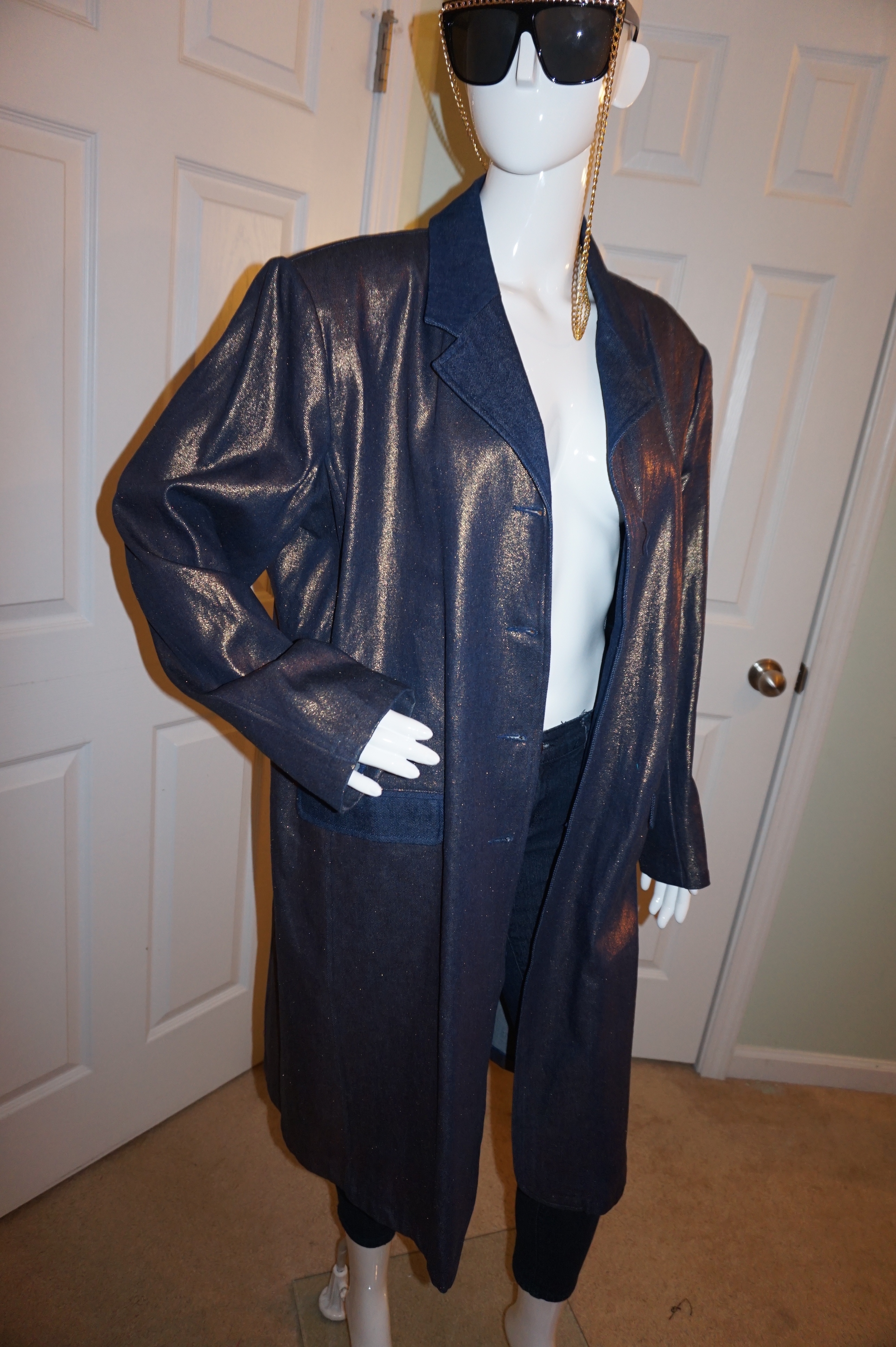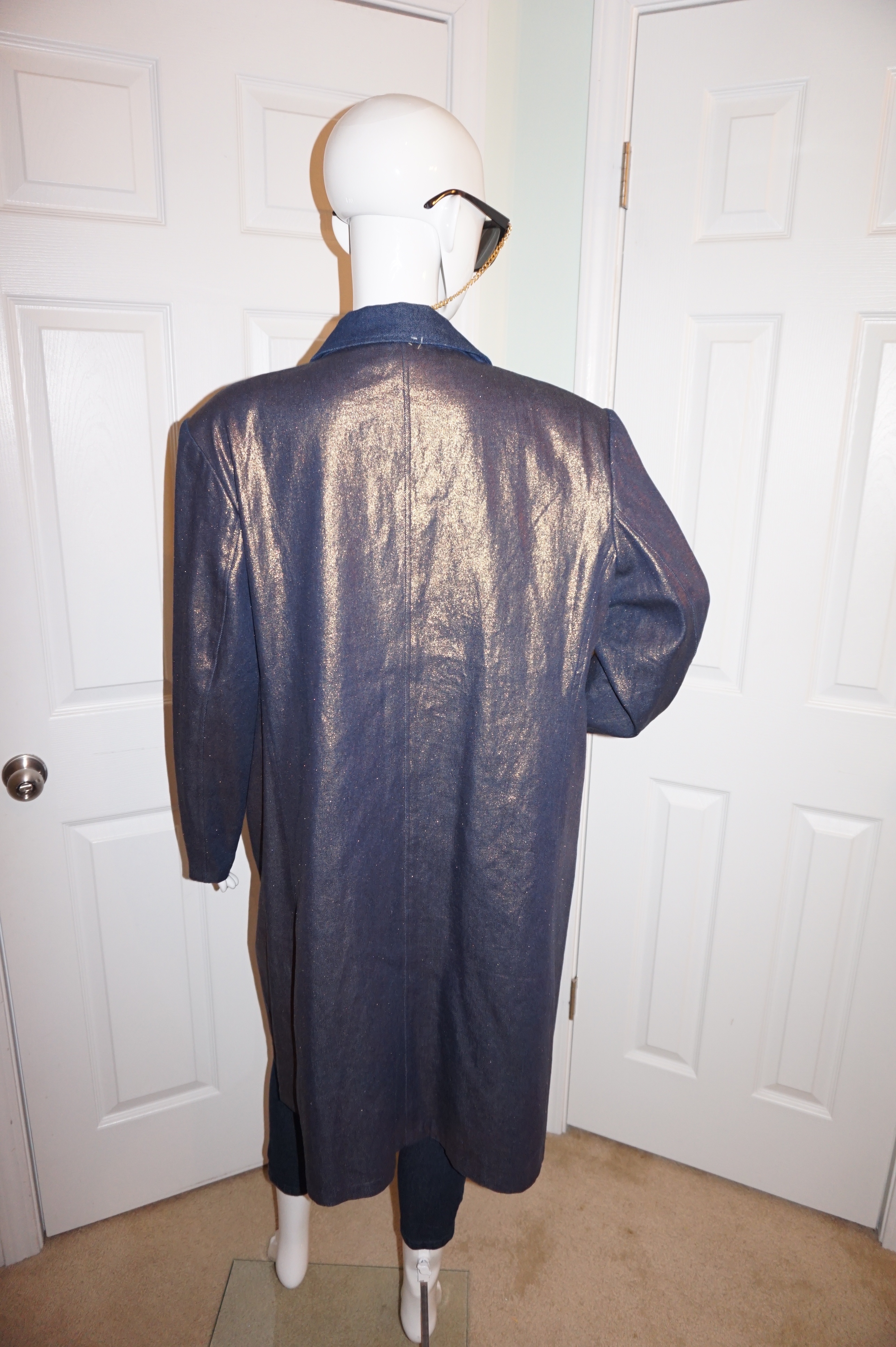 Up for sale is a lovely Vintage BGC Gold Long Jean Coat Size 1x.The material is cotton and it does not have shoulder pads. The measurements are pit to pit 23", sleeve 17", and the overall length is 42" long.