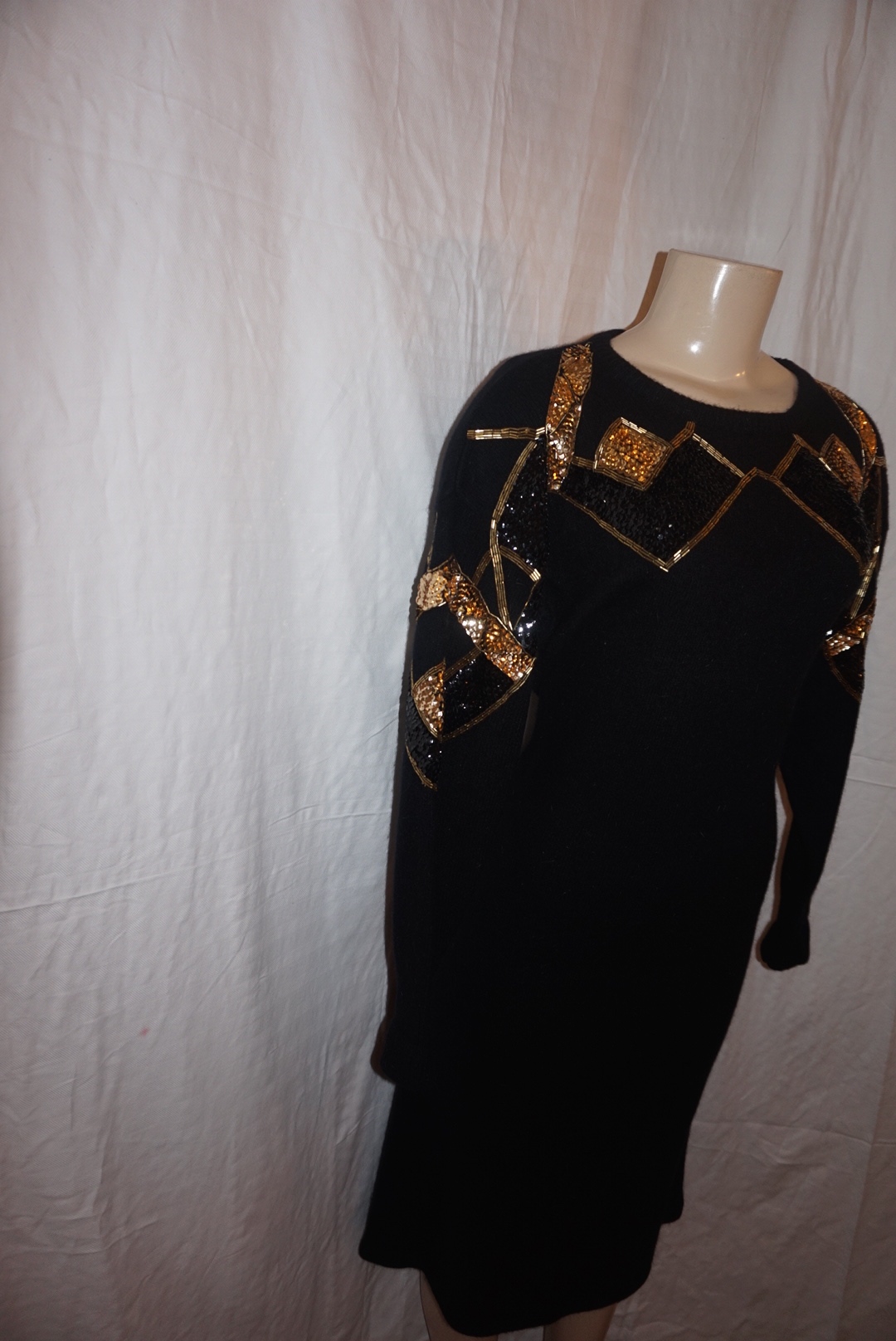 Up for sale is a lovely Vintage Megalia Black/Gold Sweater Dress Size XL.The material is wool and it does have shoulder pads. The measurements are pit to pit 22", sleeve 22", and the overall length is 45" long.