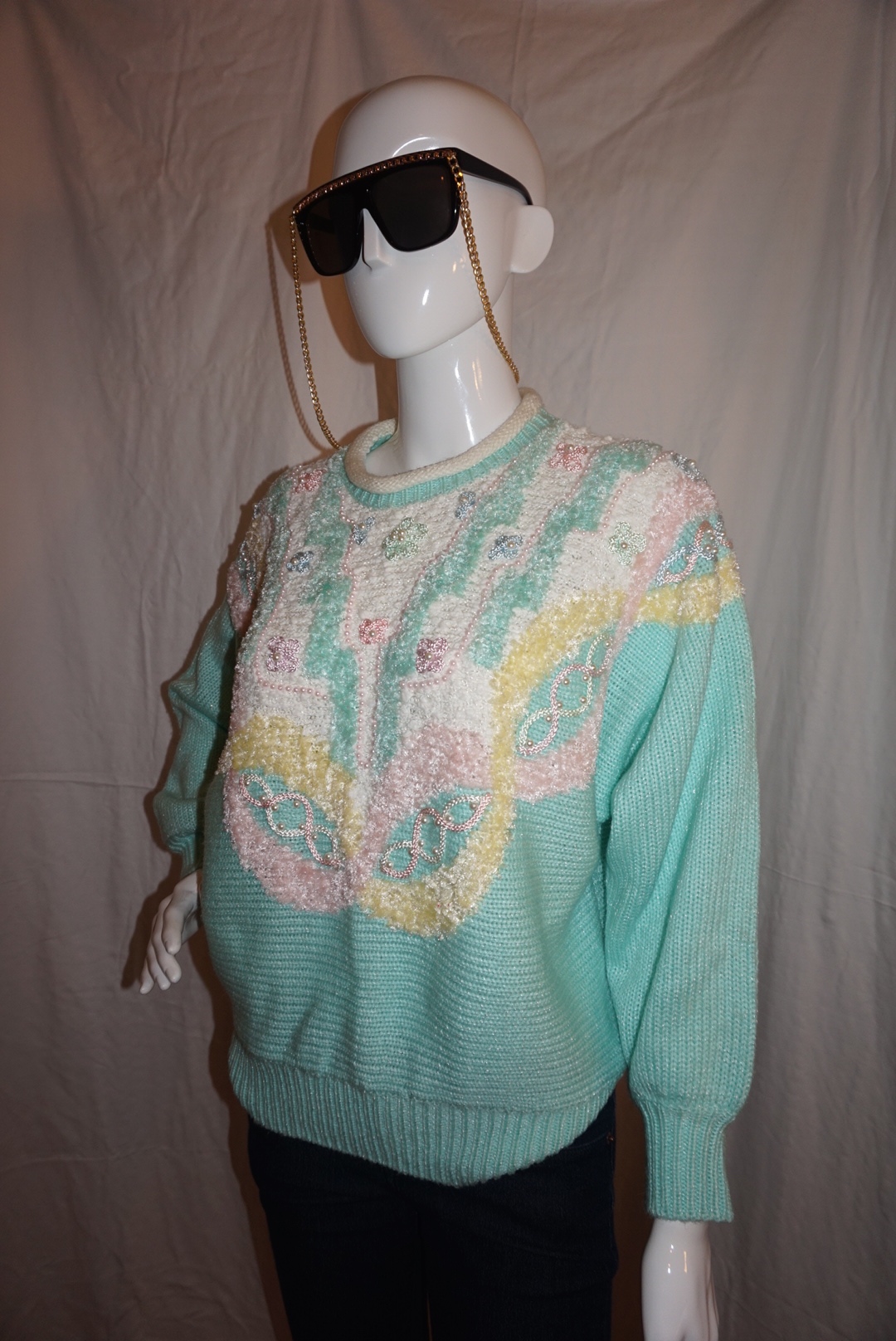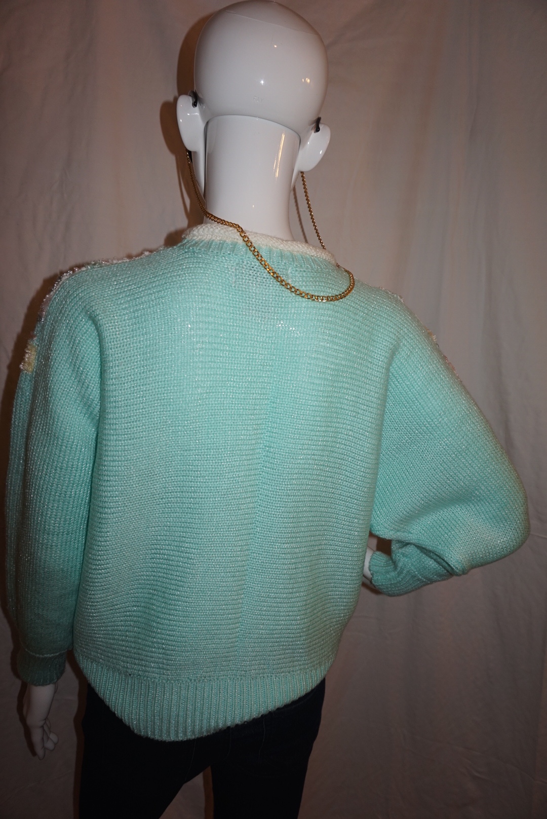 Up for sale is a lovely Vintage Jacquelyn Smith Green/White Sweater Size S-M. The material is acrylic and it does not have shoulder pads. The measurements are pit to pit 24", sleeve 17", and the overall length is 22" long.
