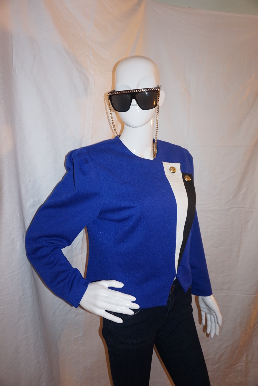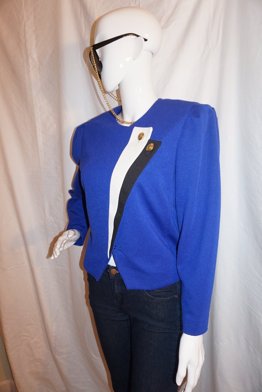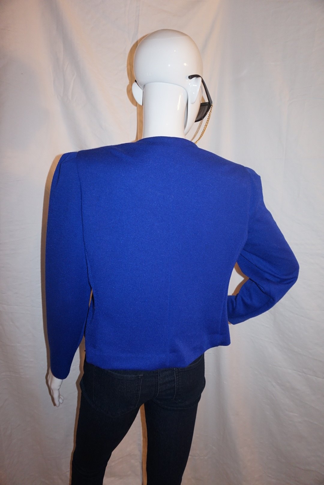 Up for sale is a Vintage Leslie Fay Blue Top Size L. The material is polyester and it does not have shoulder pads. The measurements are pit to pit 20", sleeve 16", and the overall length is 21" long.