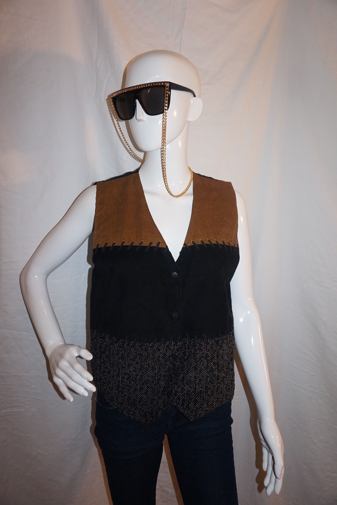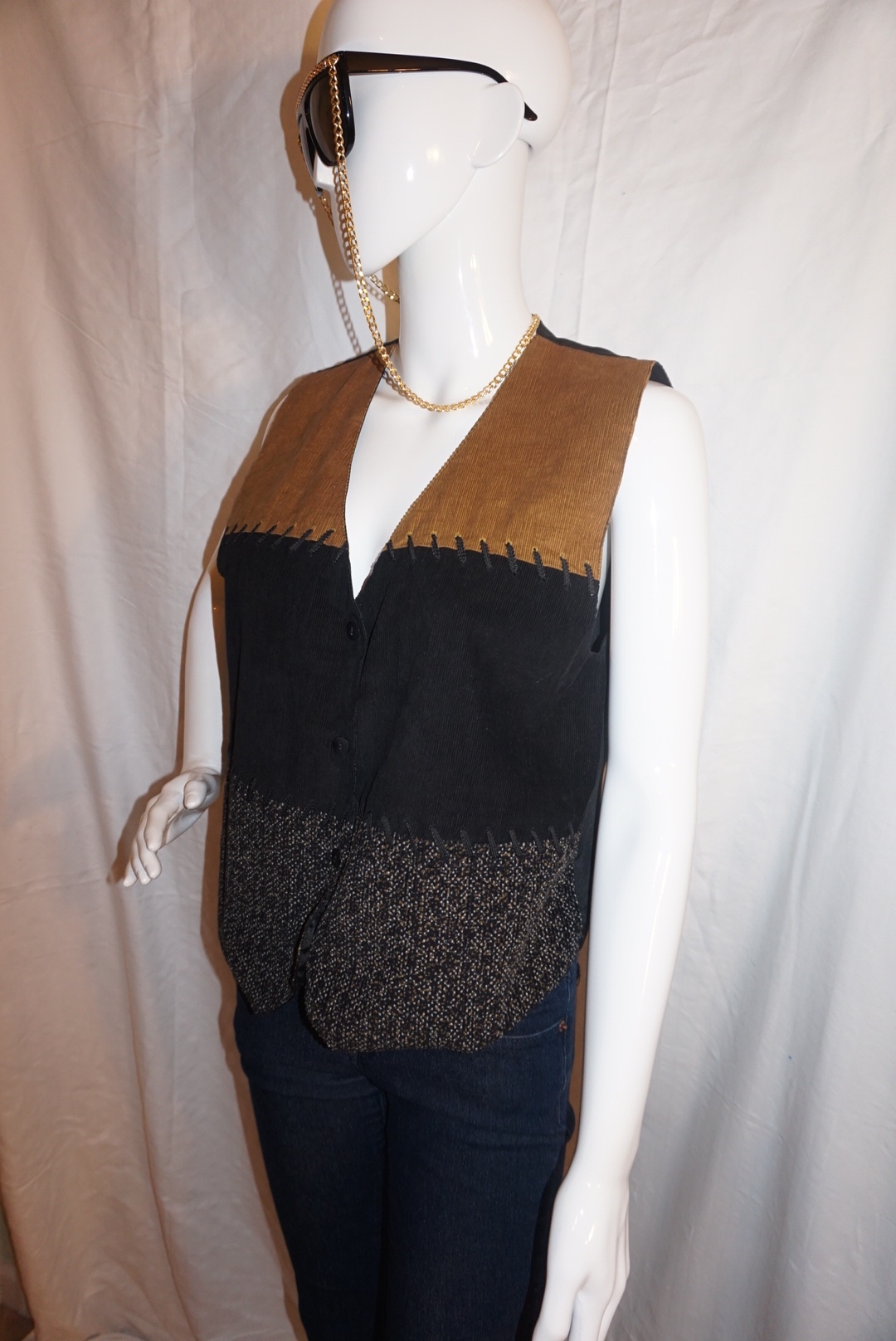 Up for sale is a lovely Vintage Paul Harris Brown Black Vest Size S. The material is cotton and it does not have shoulder pads. The measurements are pit to pit 14", and the overall length is 22" long.