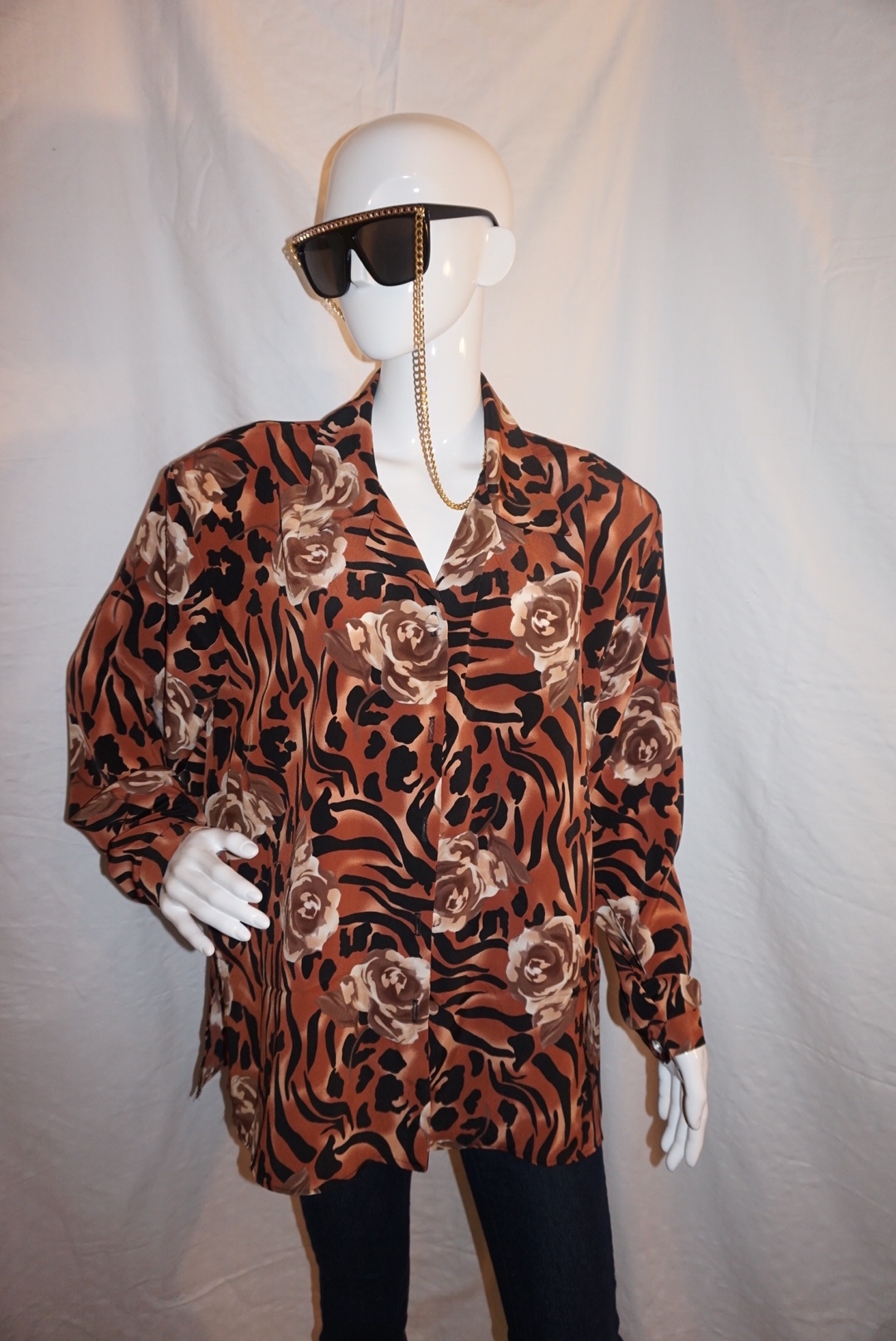 Up for sale is a lovely Vintage Brown Animal Print Top Size 1x.The material is polyester and it does have shoulder pads. The measurements are pit to pit 26", sleeve 17", and the overall length is 27" long.