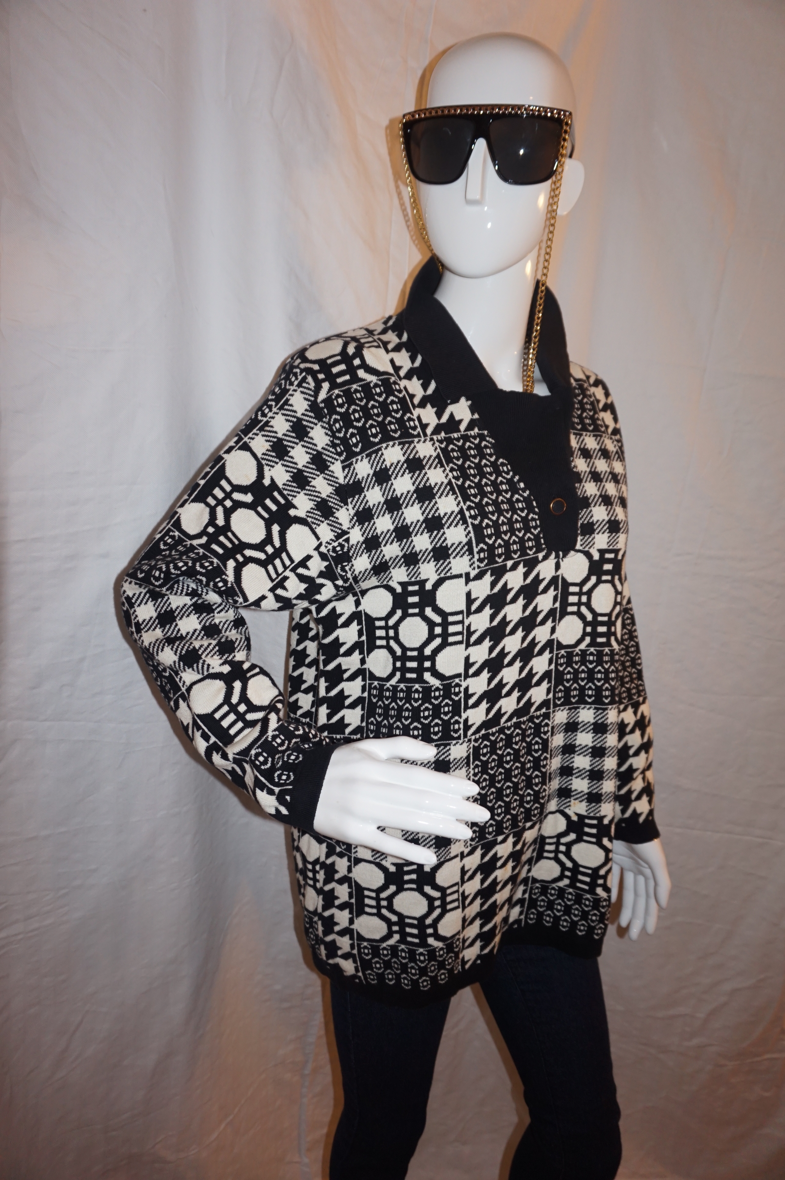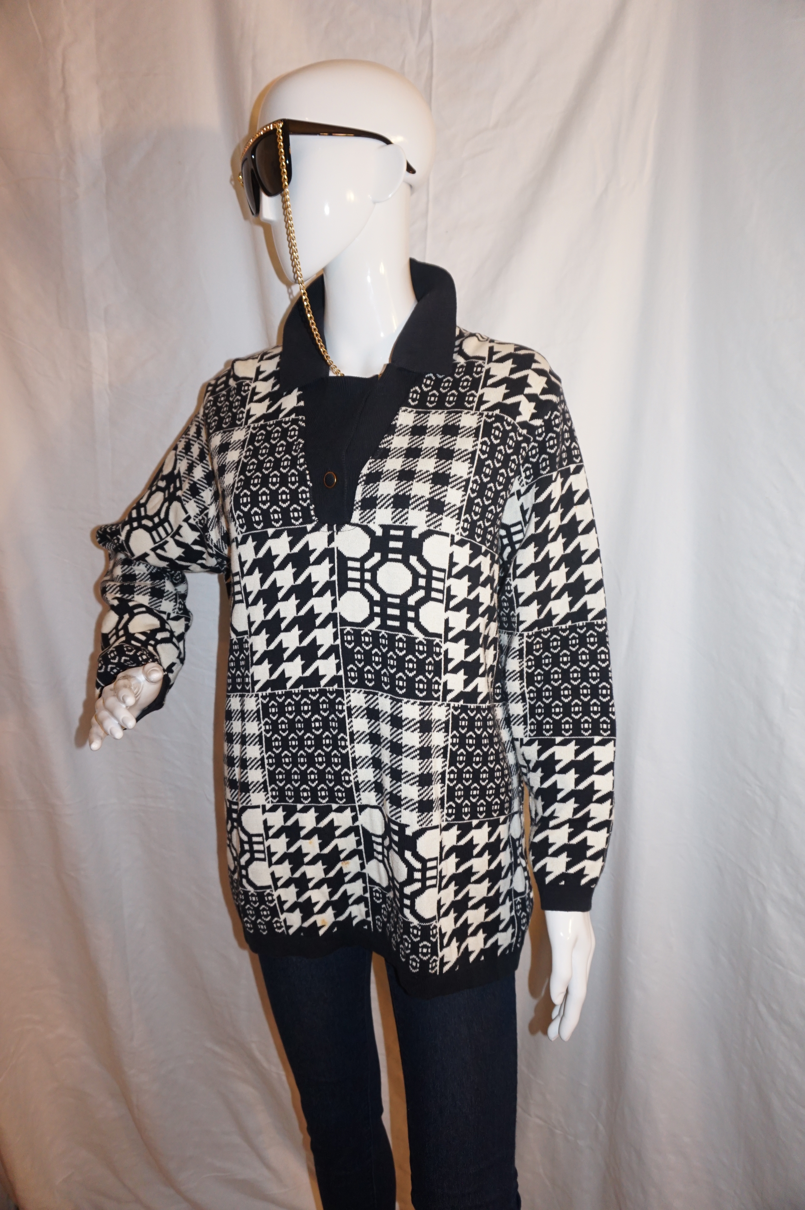Up for sale is a lovely Vintage Bleyle Black white Sweater Size 1x. The material is cotton and it does not have shoulder pads. The measurements are pit to pit 22", sleeve 17", and the overall length is 28" long.