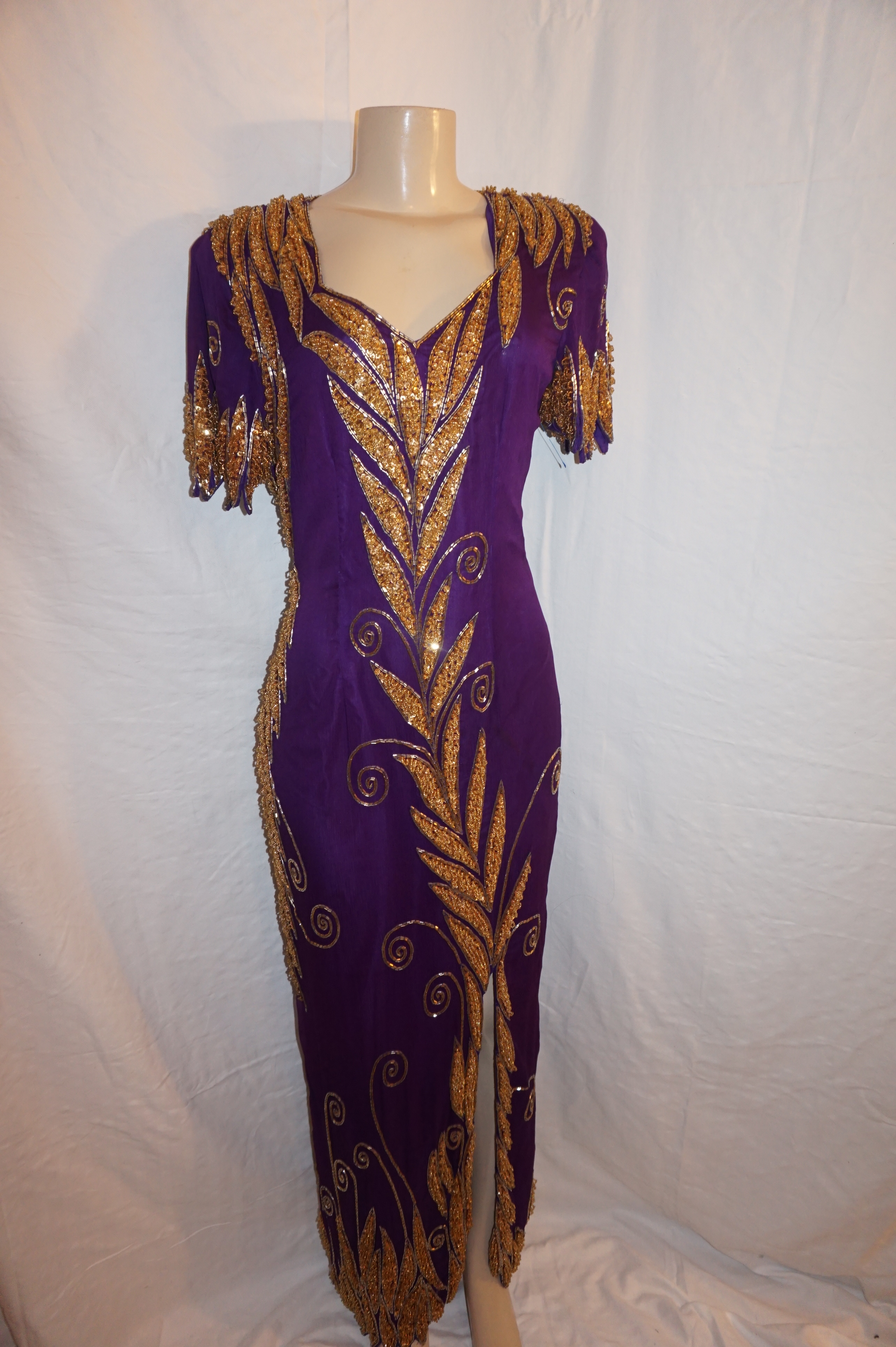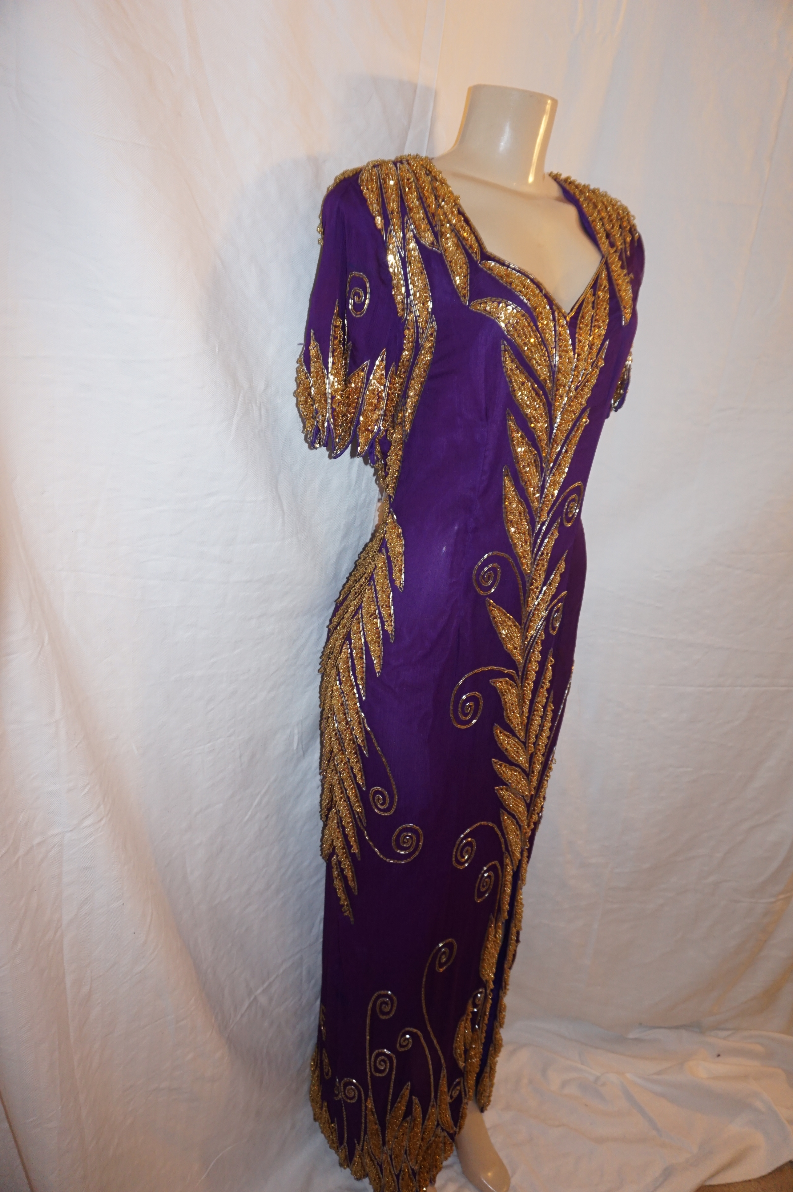 Up for sale is a lovely Vintage Purple Gold/Sequins Dress (small stain) Size M. The material is silk and it does have shoulder pads. The measurements are pit to pit 18", and the overall length is 60" long. There is a small stain on the back of the dress which i think can be cleaned.