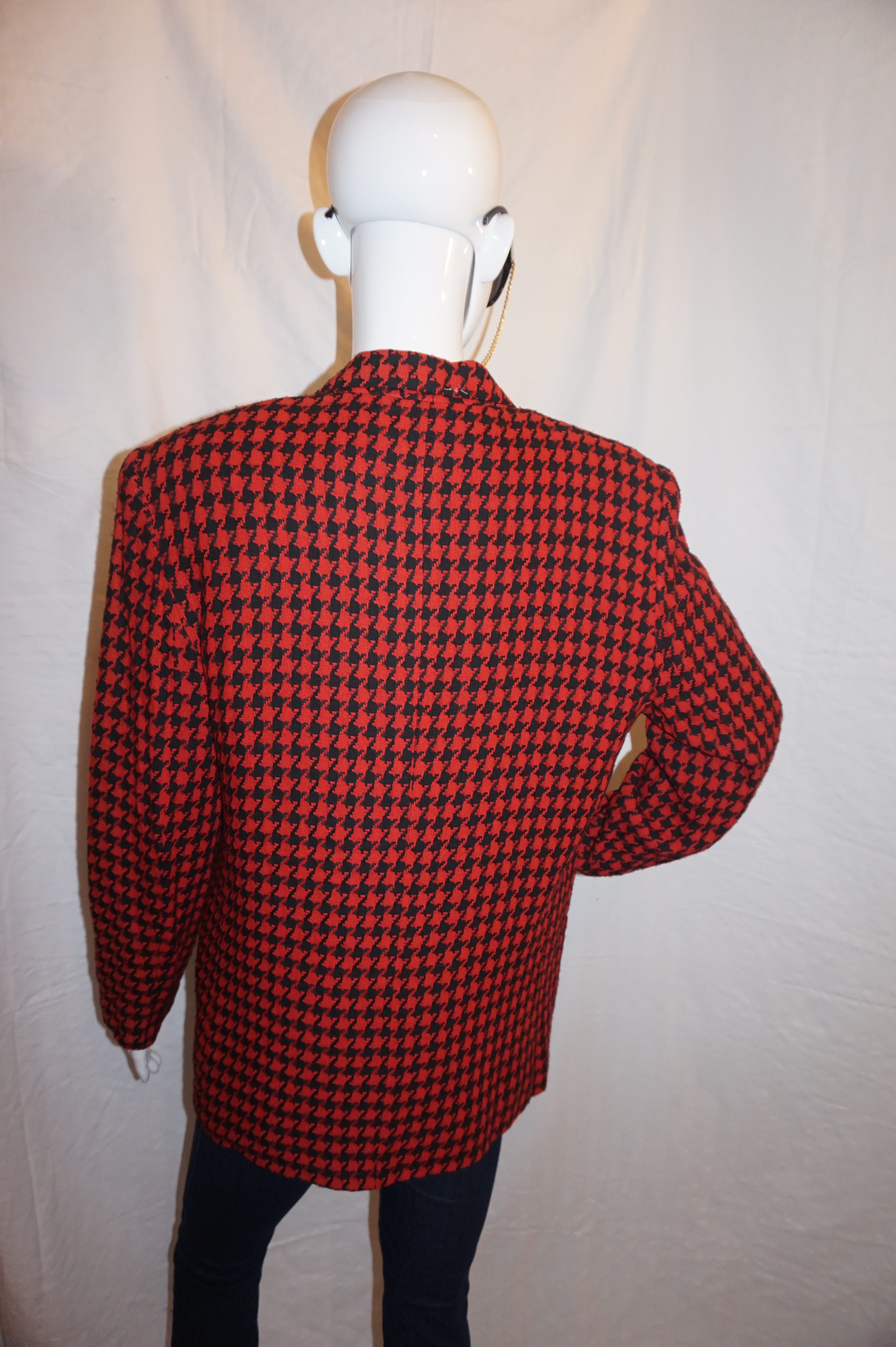 Up for sale is a lovely Vintage Cedars Red/Black Blazer Size M-L. The material is rayon and it does have shoulder pads. The measurements are pit to pit 20", sleeve 16", and the overall length is 29" long.