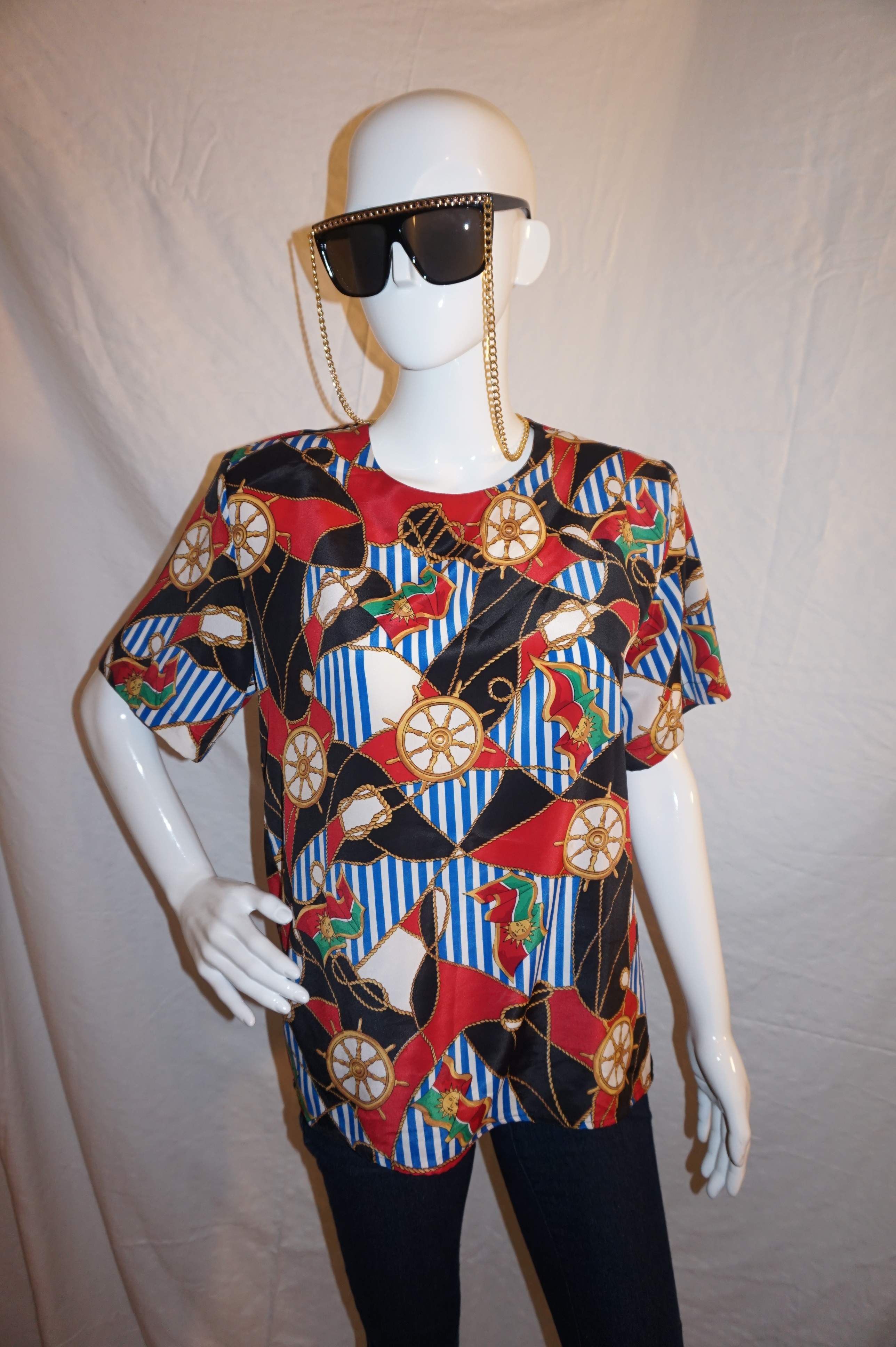 Up for sale is a lovely Vintage Notations Nauticial Top Size L. The material is polyester and it does have shoulder pads. The measurements are pit to pit 21",and the overall length is 24" long.
