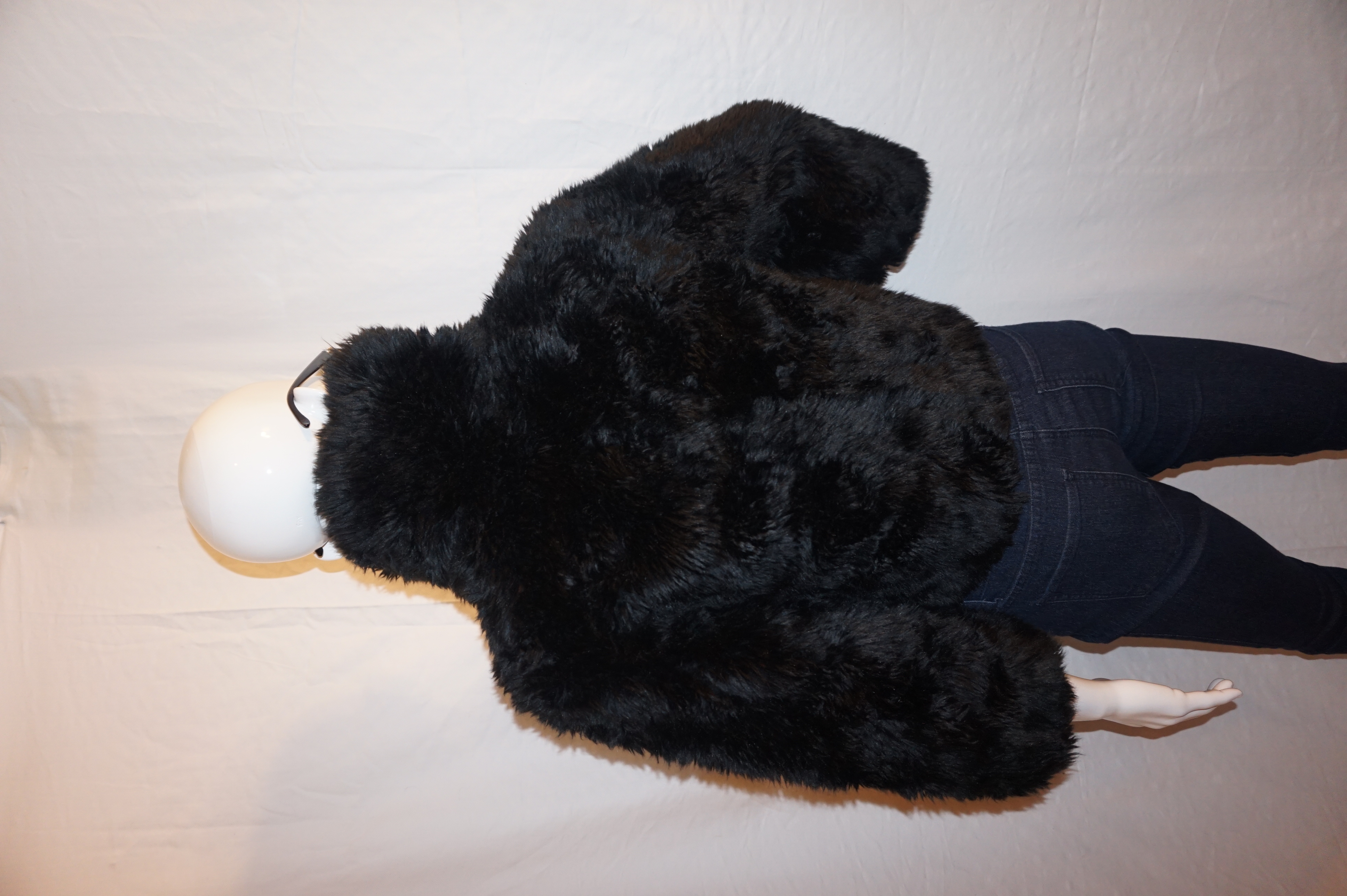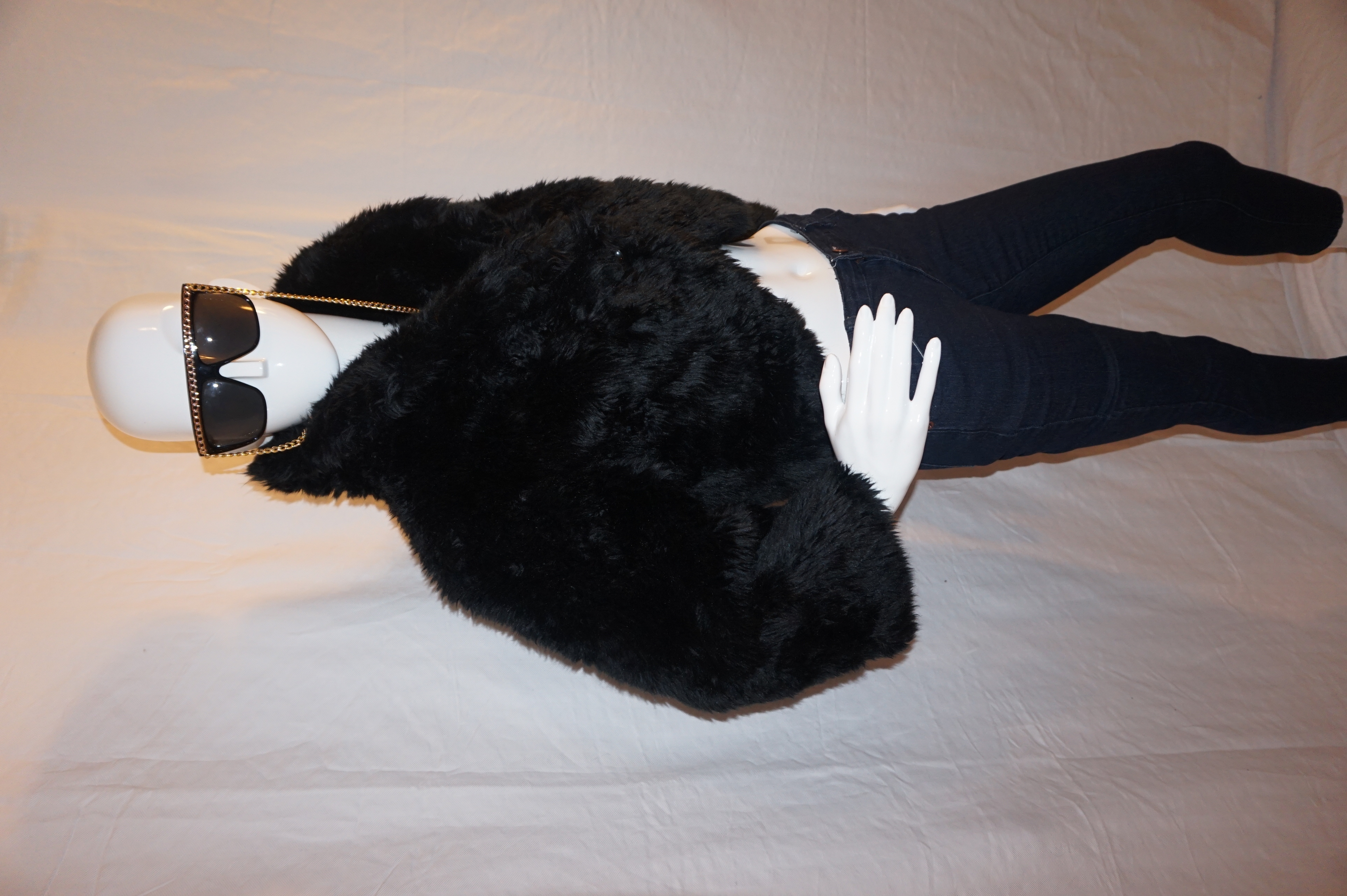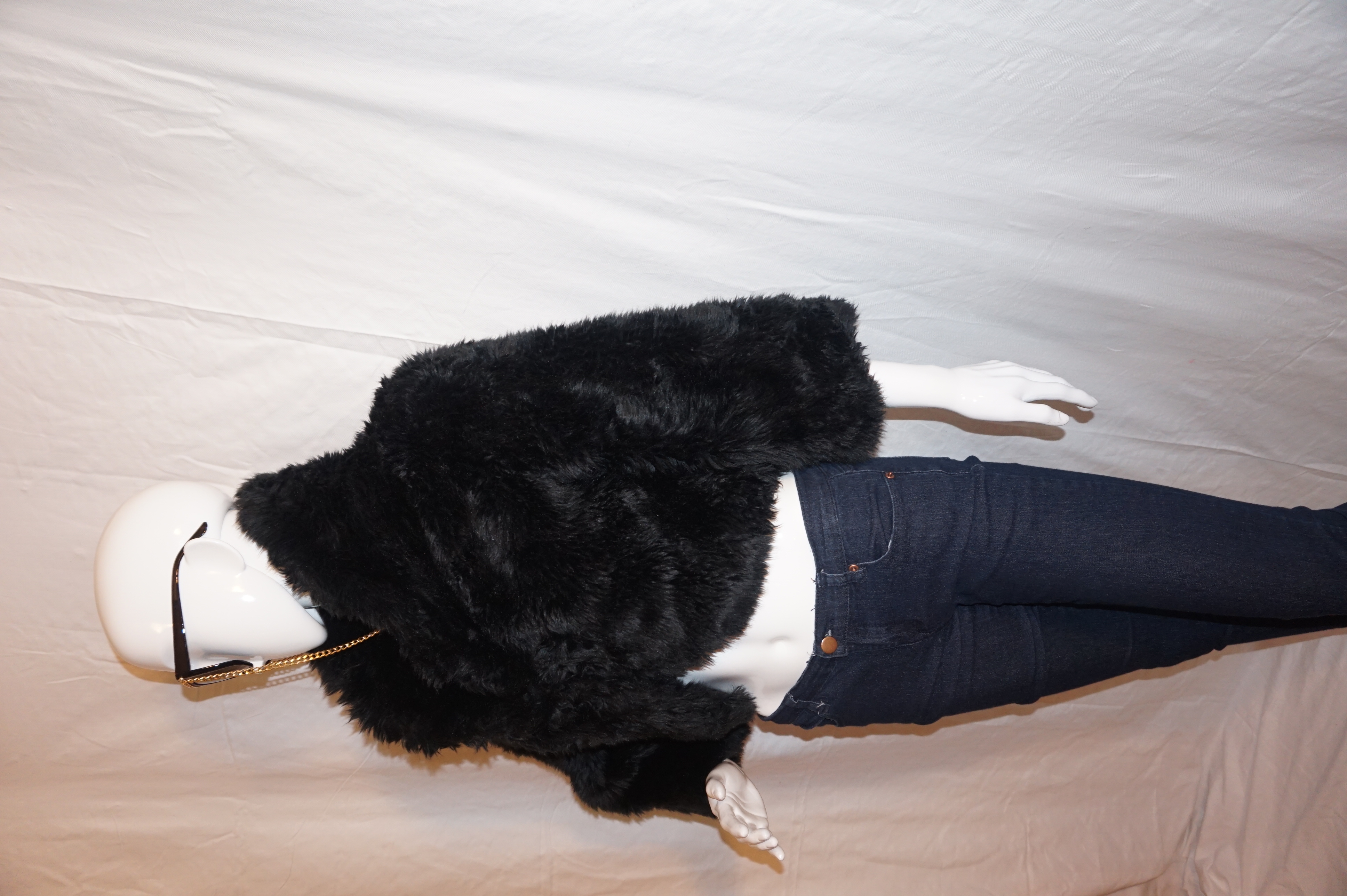 Up for sale is this lovely Vintage Finesse Black Fur Throw size S-M. The material is Acrylic and it does not have shoulder pads. The measurements are pit to pit 19", sleeve 12", and the overall length is 16" long.