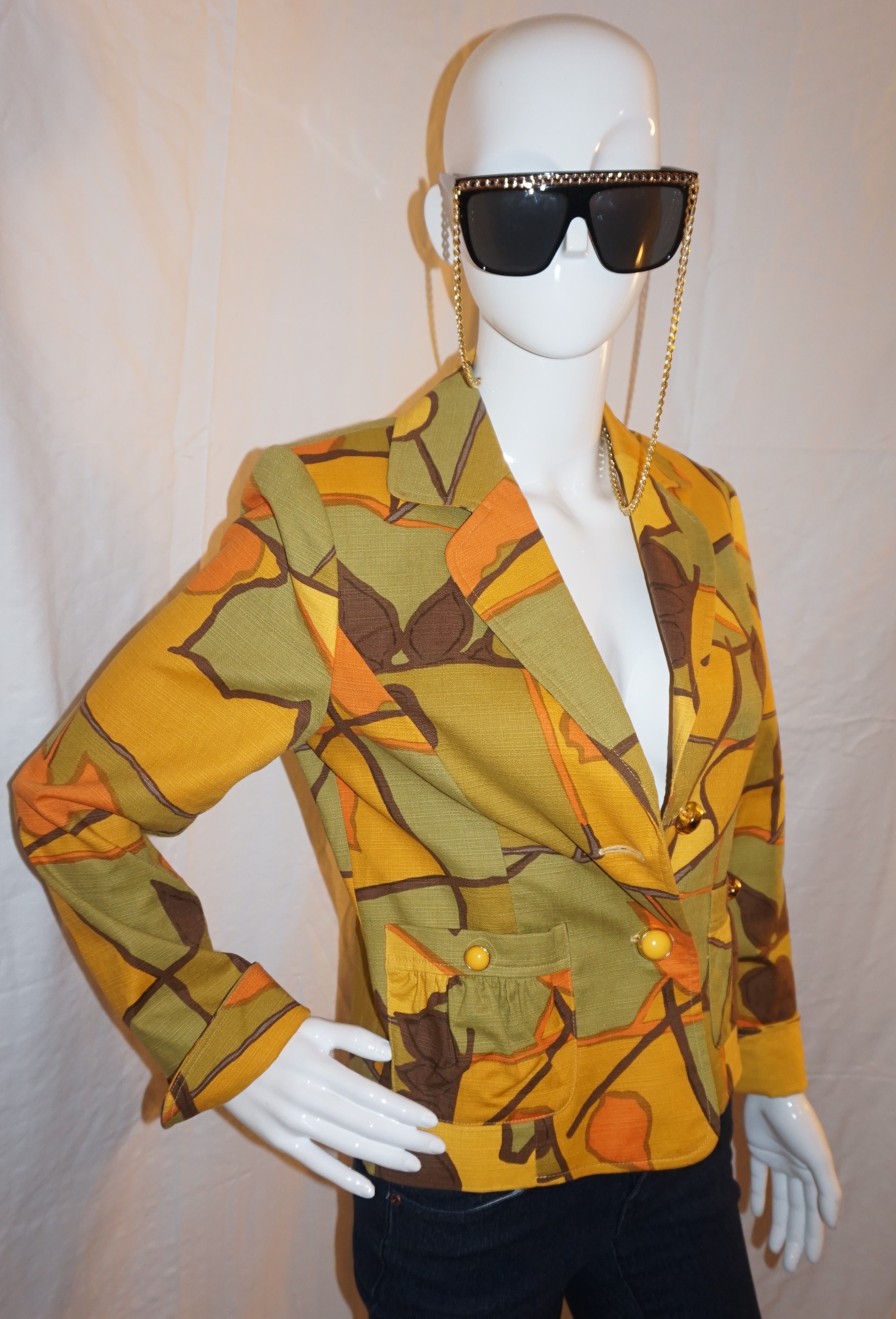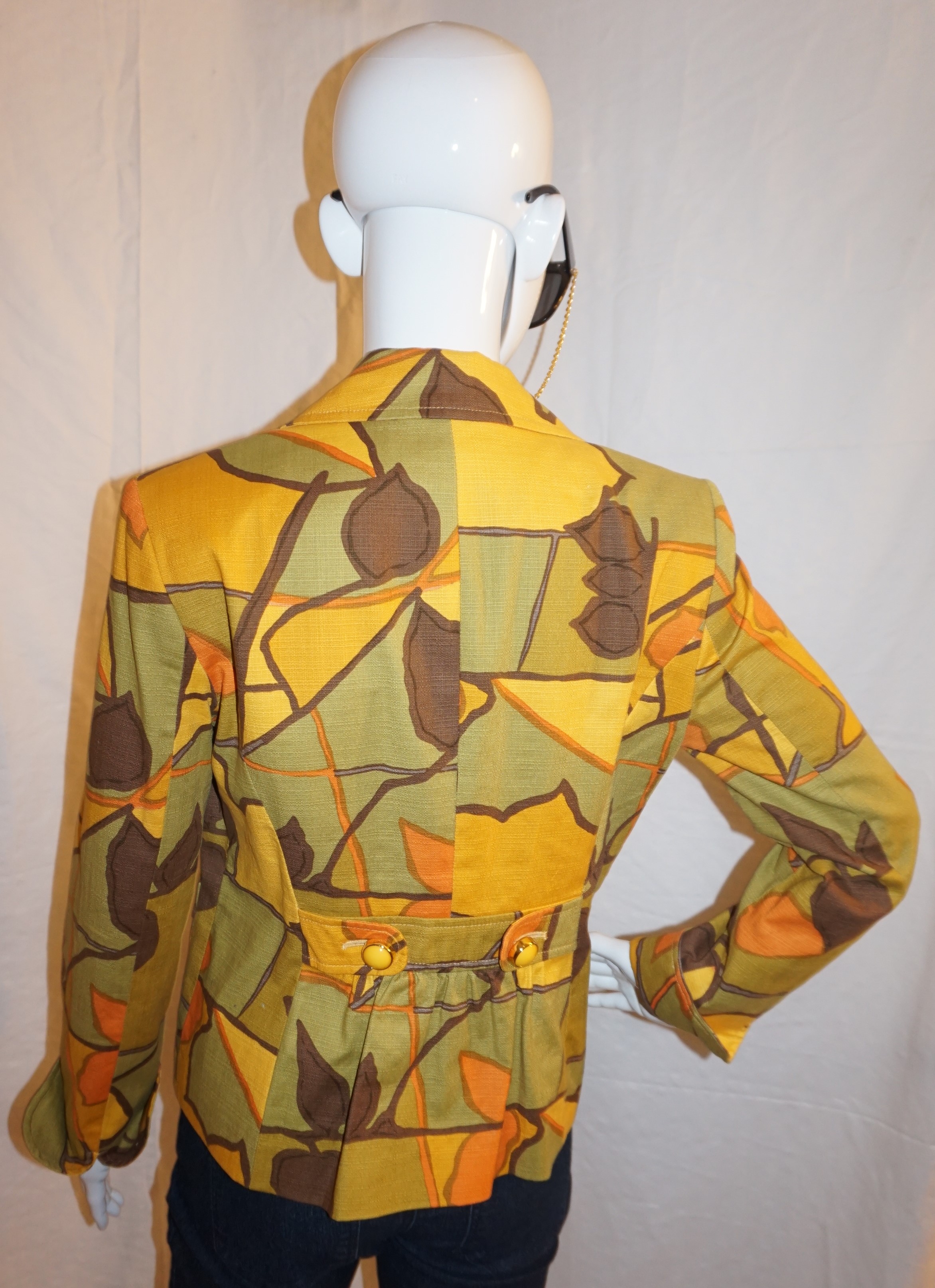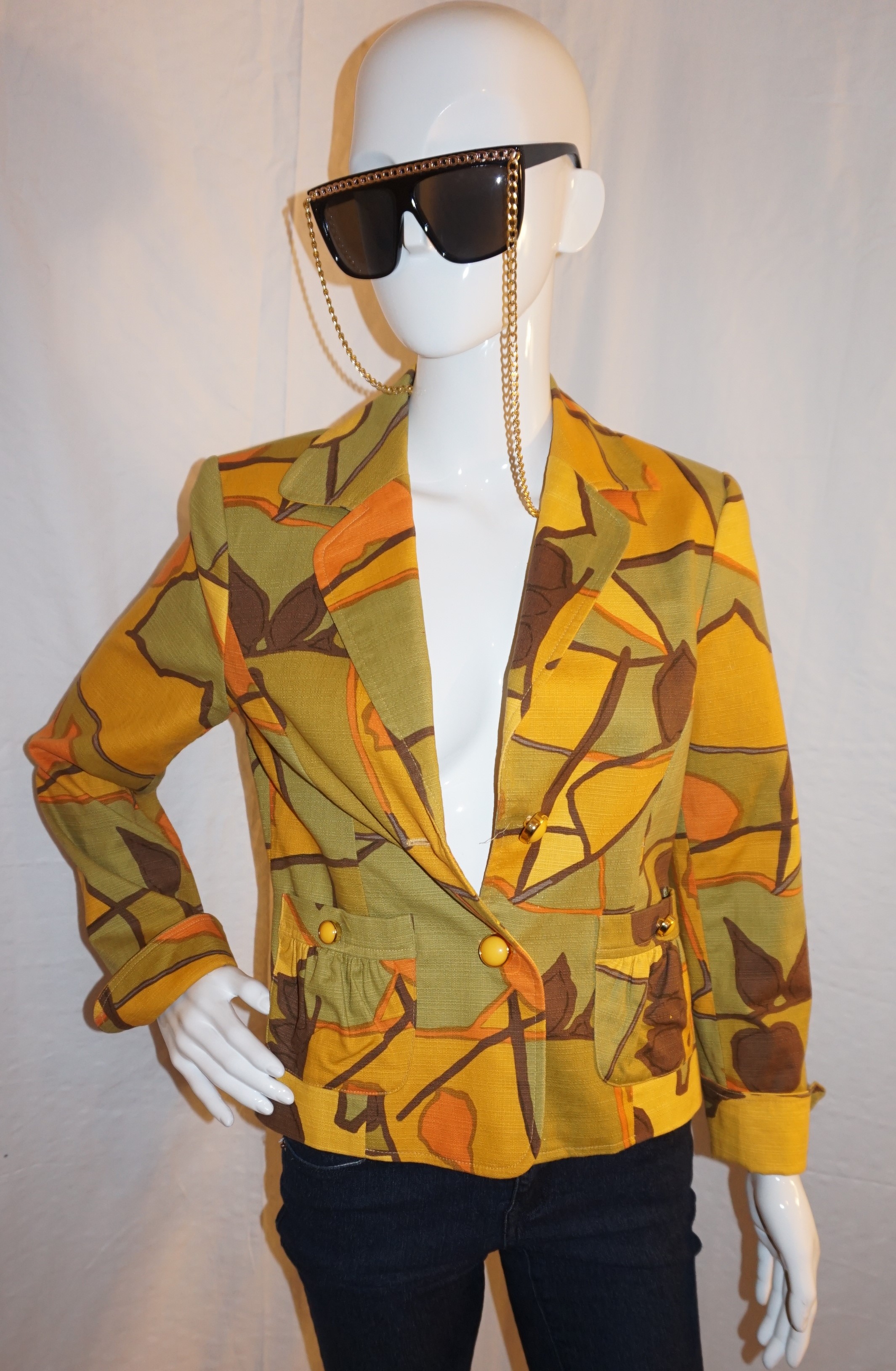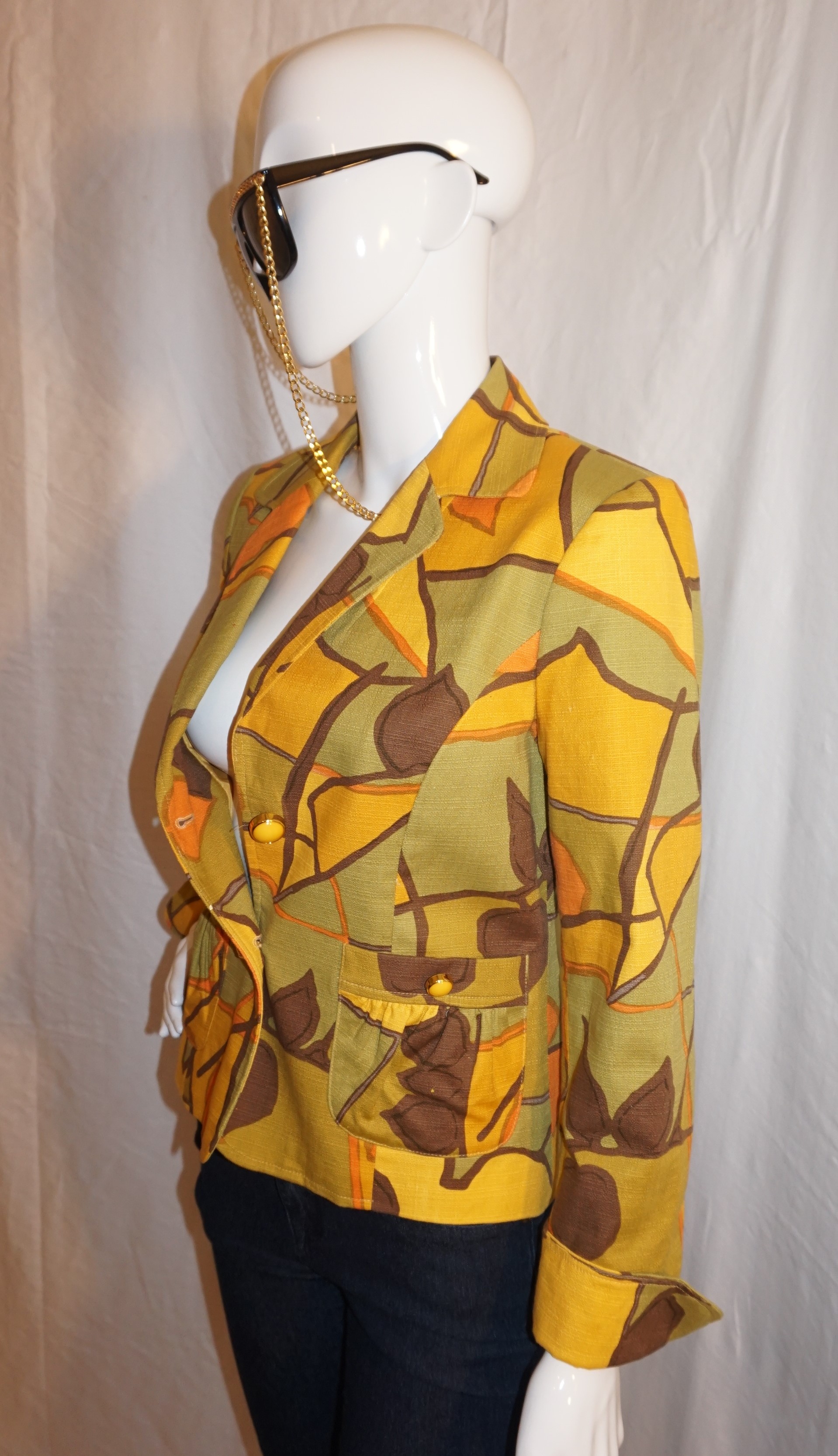 Vinatge Kasper Green/Yellow Blazer is a size small. Material is cotton and it does have shoulder pads. Measurements pit to pit are 18", sleeve 15" and overall length 21".