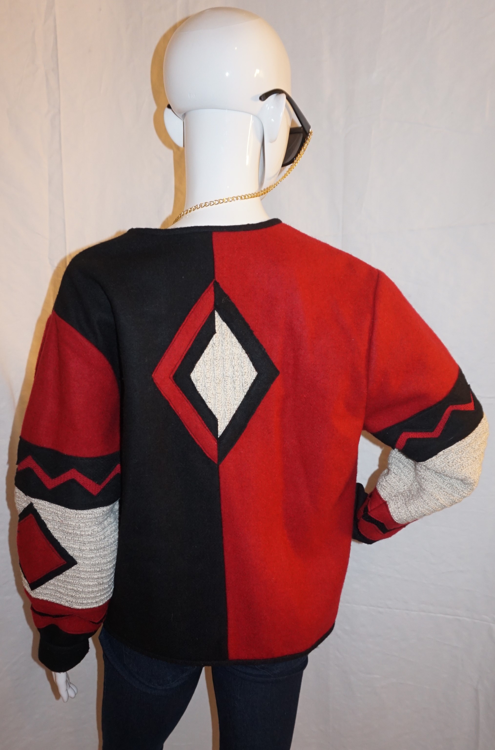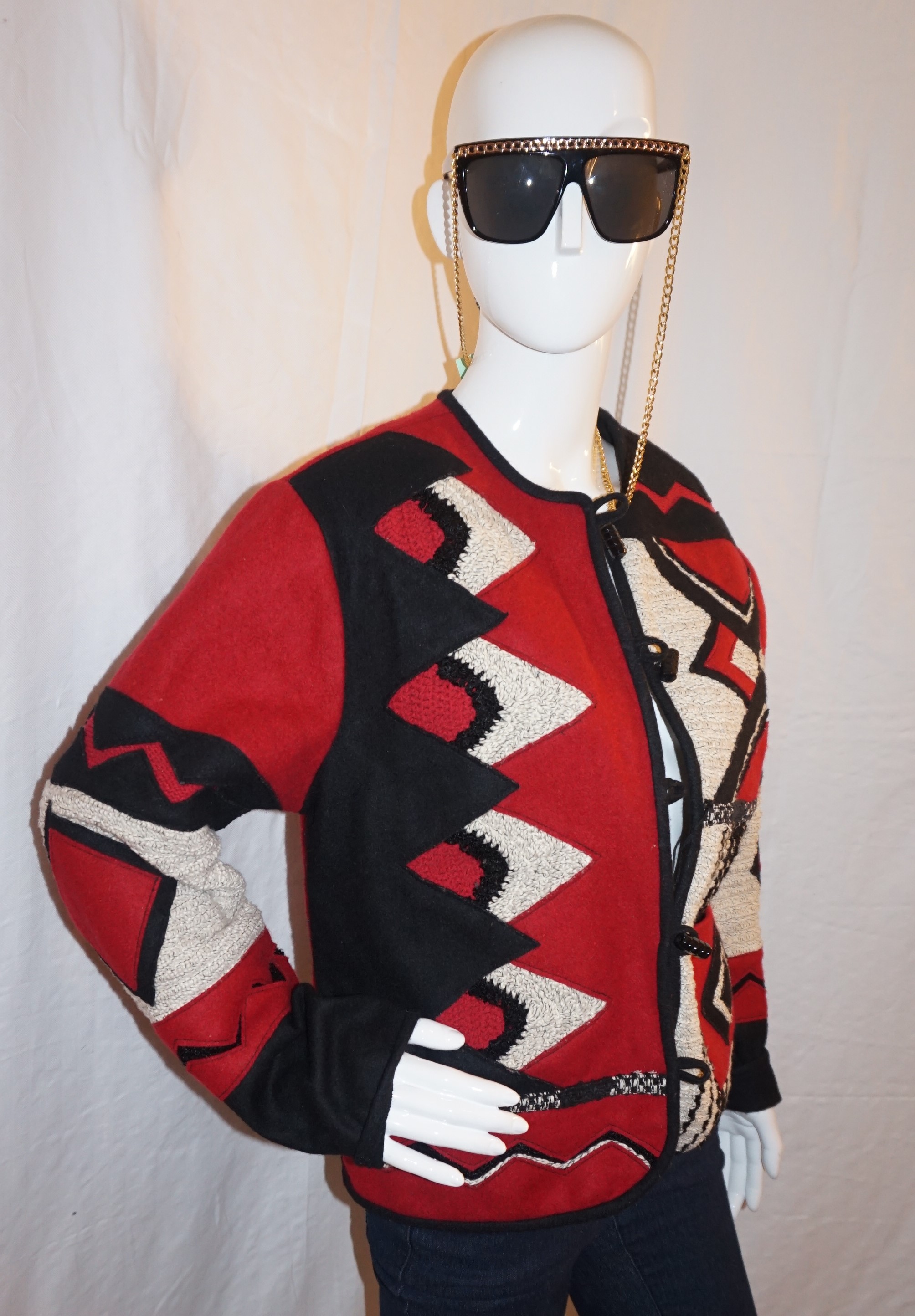 This gorgeous red and black Cold Water Creek Jacket is up for grabs. Although it's missing a button you'll still look amazing in this wool jacket. Size large with measurements of pit to pit 21", sleeve 17" with overall length of 24". There are no shoulder pads included.