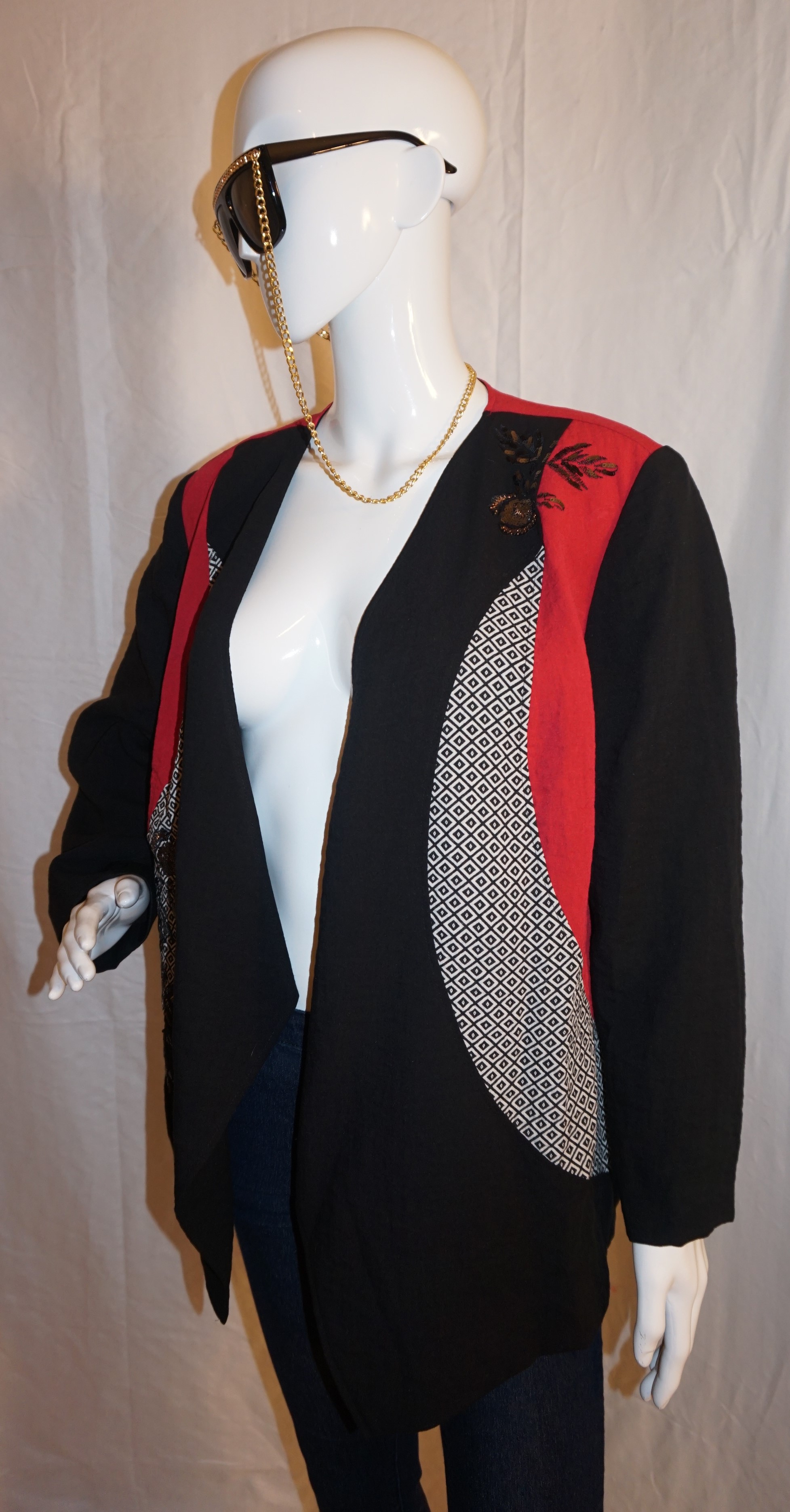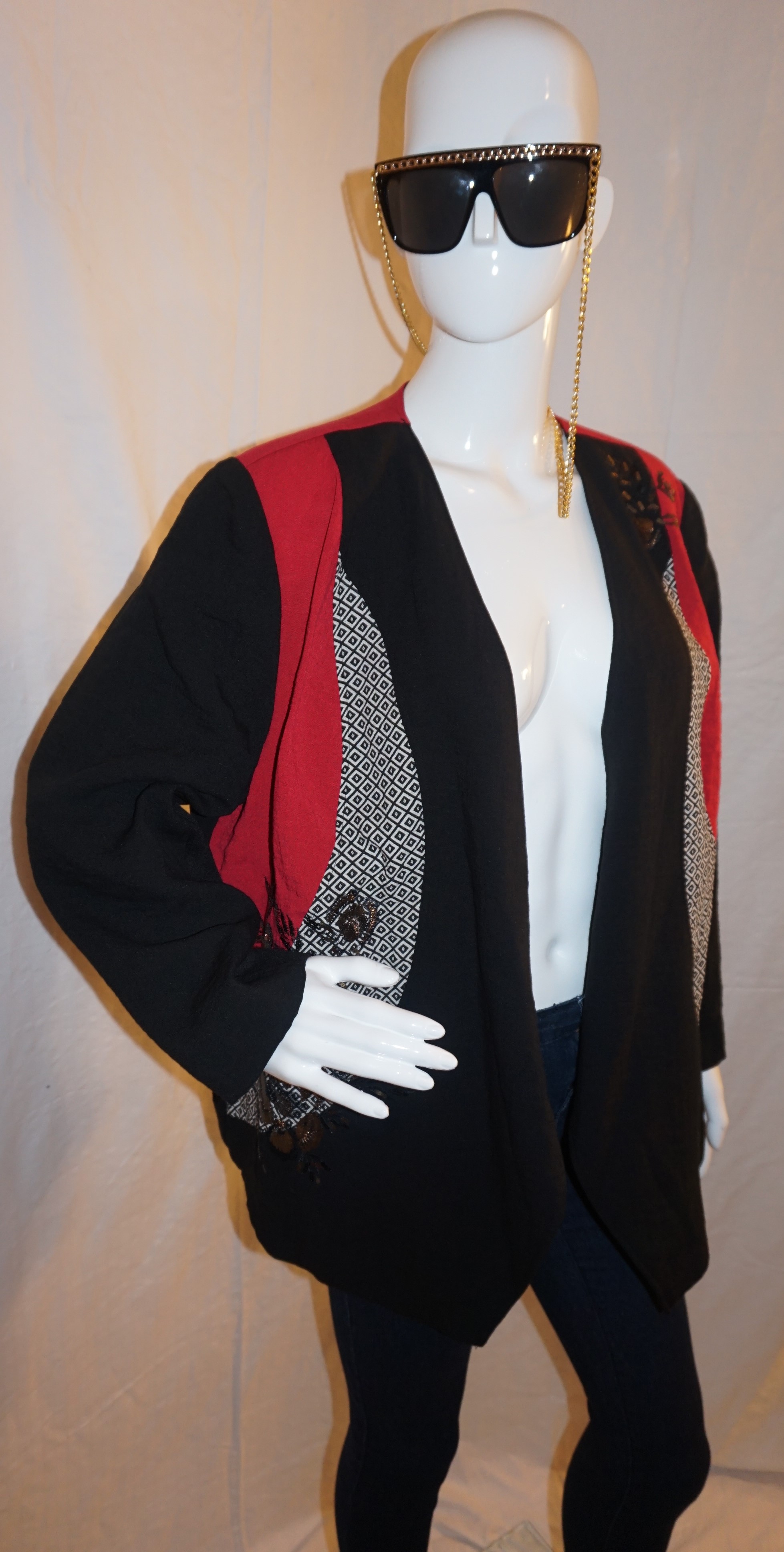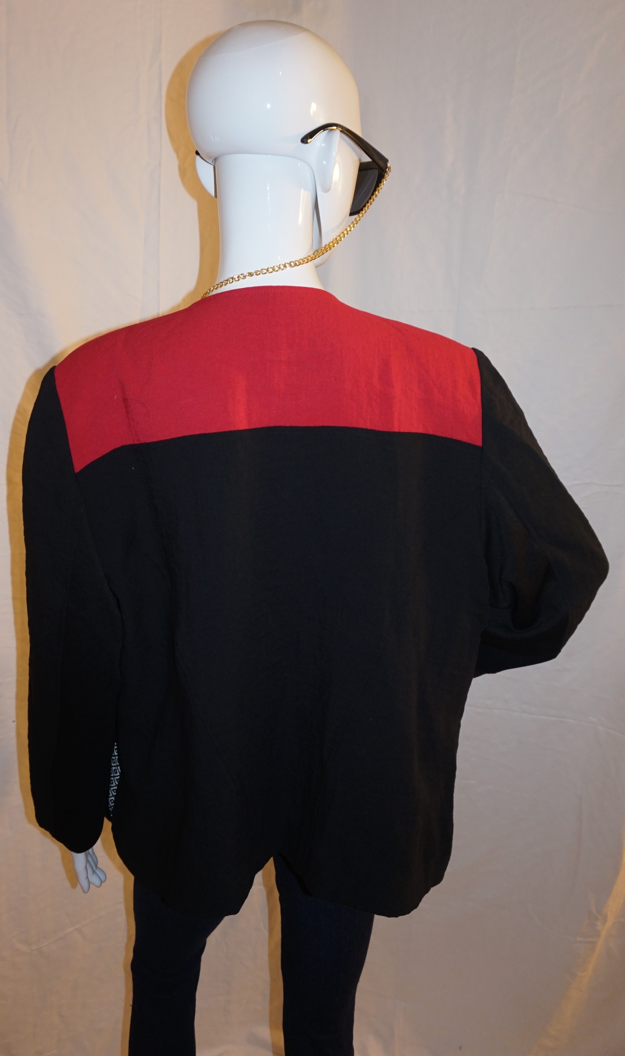 Up for sale is this Vintage Chico's Black & Red Throw size 1x. The material is rayon and it does have shoulder pads. The measurements are 24" pit to pit, sleeve 14", with overall length 28".