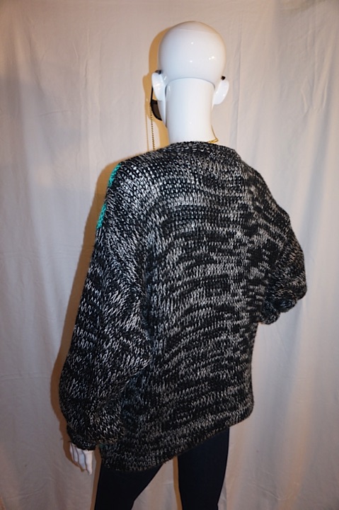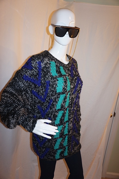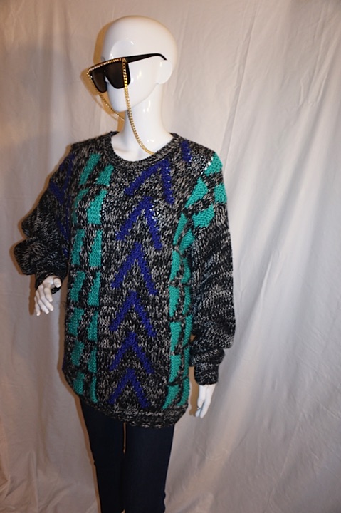 Up for sale is this Vintage 1440 Black/Green/Purple Sweater, size 1X-2X. The material is acrylic with measurements of 24" pit to pit, sleeve 24", with overall length 30". Sweater does not have shoulder pads.