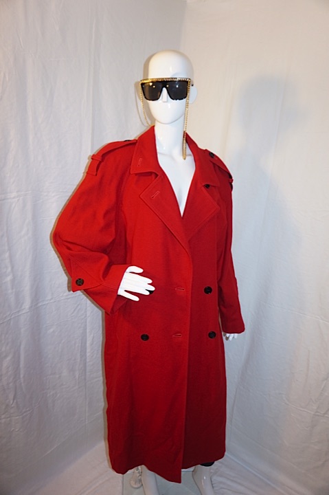 Up for sale is this Vintage International Red Wool Coat, Size extra large. The material is wool with measurements of 22" pit to pit, sleeve 16", with overall length 46". Coat does not have shoulder pads.