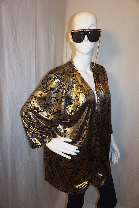 Up for sale is this Vintage Risa Ann Black/Gold Metallic Top, Size 1X. The material is polyester with measurements of 26" pit to pit, sleeve 11", with overall length 31". It does have shoulder pads.