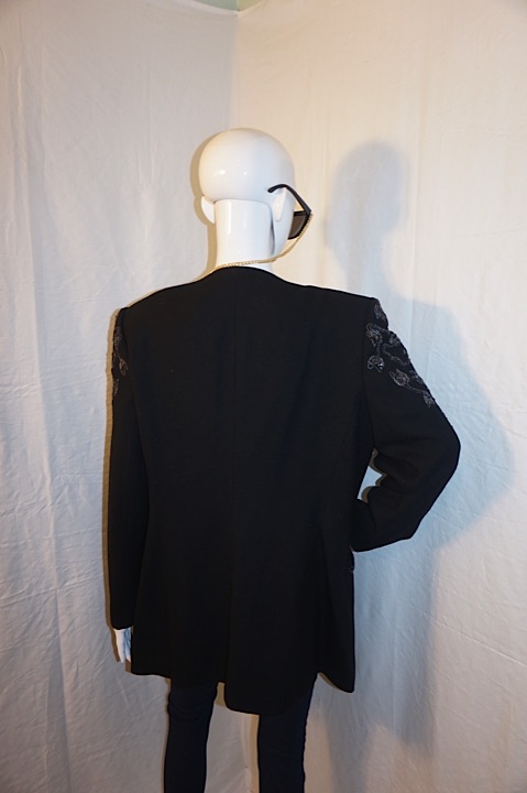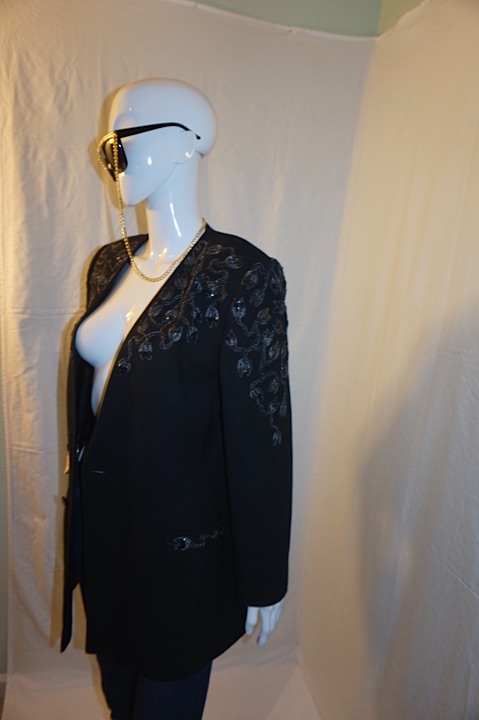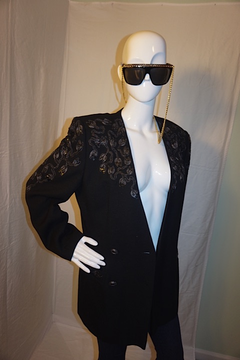 Up for sale is this Vintage John Meyer Black Sequins Blazer, size M-L. The material is wool with measurements 19" pit to pit, sleeve 16", with overall length 30" . The blazer does have shoulder pads.