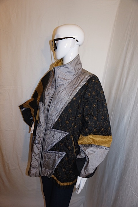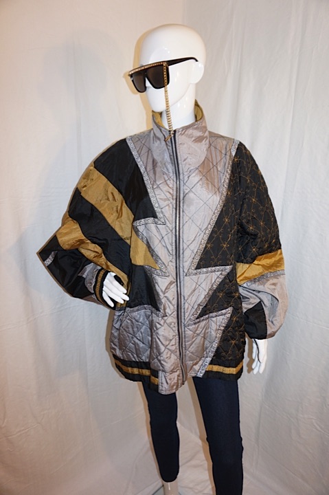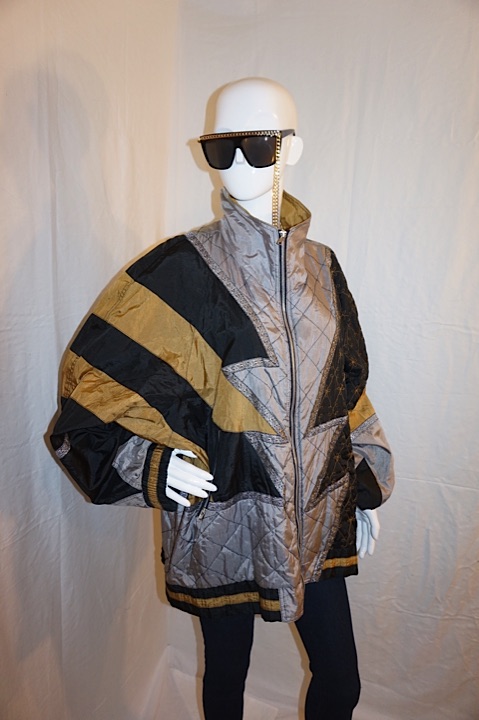 Up for sale is this Vintage Venezia Black/Gold Bomber, size 3X. The material is nylon and it does not have shoulder pads. The measurements are 30" pit to pit, sleeve 19", with overall length 28".