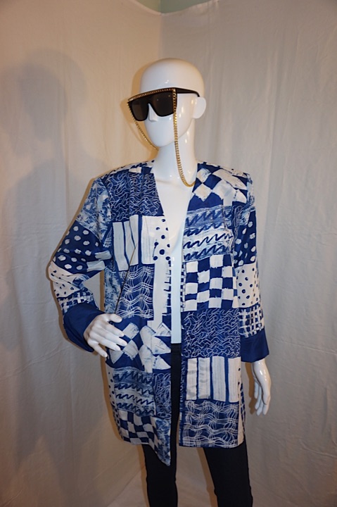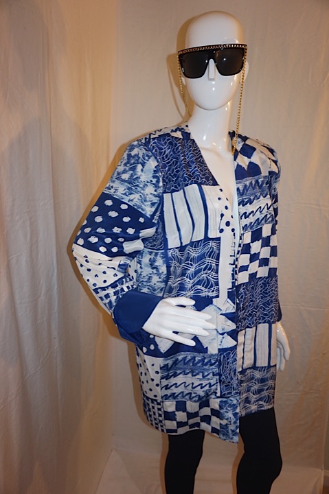 Up for sale is this Vintage Lady Carol Blue/White Throw, size 1X. The material is polyester and it does have shoulder pads. The measurements are 22" pit to pit, sleeve 15", with overall length 21".