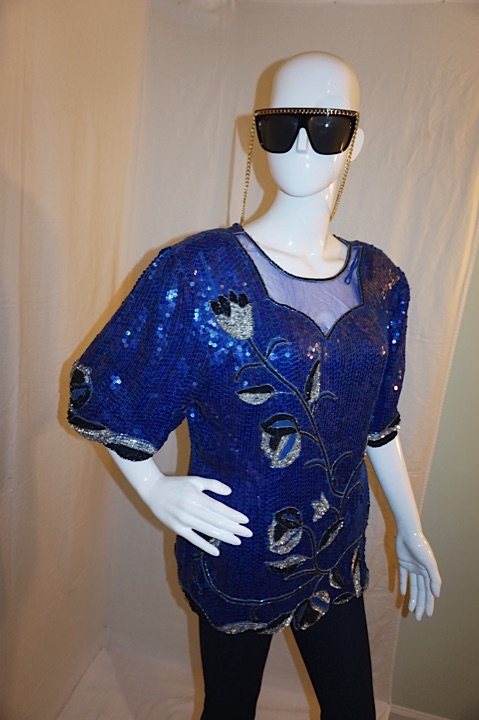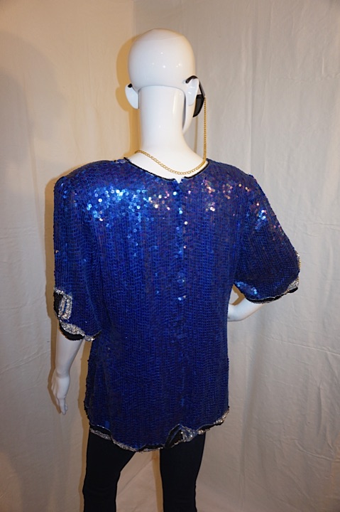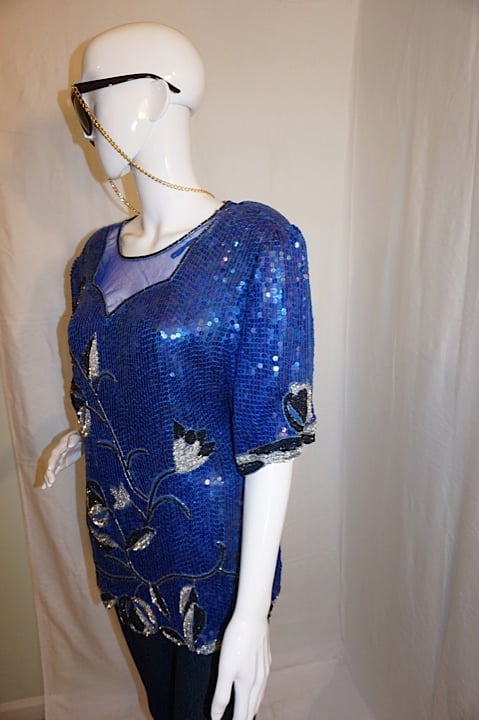 Up for sale is this Vintage Royal Feelings Blue Sequins Top, size XL. The material is silk and it does have shoulder pads. The measurements are 22" pit to pit, with overall length 26".