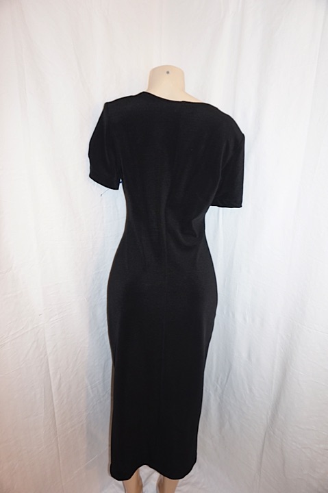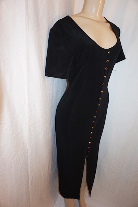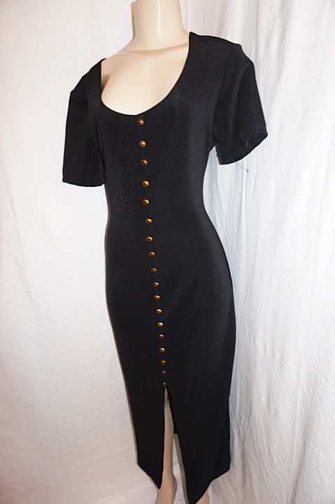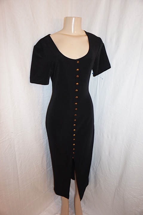 Up for sale is lovely Vintage Dawn Joy Black/Gold Button Dress, Size M.