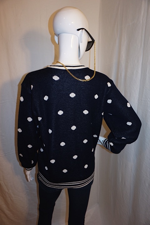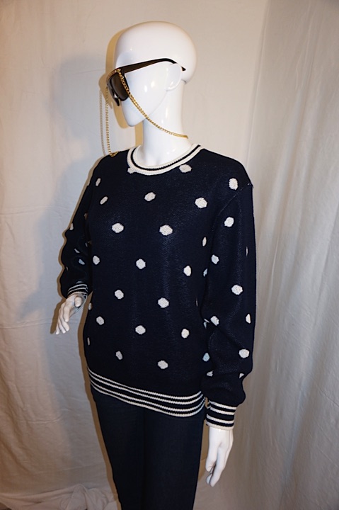 Up for sale is this Vintage Alfred Dunner Navy Blue/White Polka Dot Sweater, size M-L. The material is acrylic and it does not have shoulder pads. The measurements are 20" pit to pit, sleeve 20", with overall length 24".