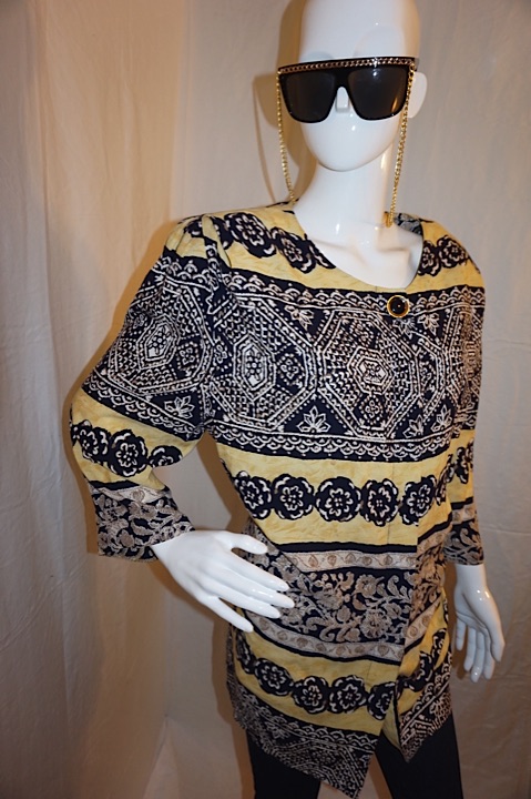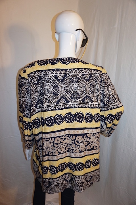 Up for sale is this Vintage Robert Todd Blue/Yellow Aztec Top, size 2X. The material is rayon and it does have shoulder pads. The measurements are 23" pit to pit with overall length 32".
