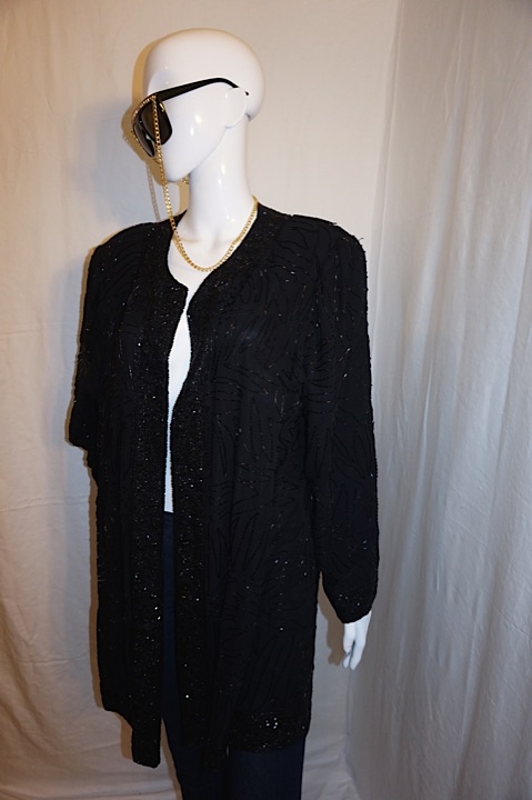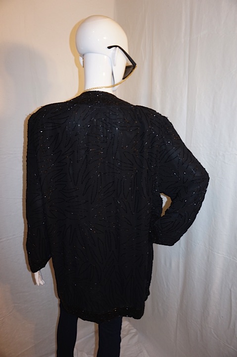 Up for sale is this Vintage Brillante Black Sequns Throw, size 3X. The material is polyester and it does have shoulder pads. The measurements are 26" pit to pit, sleeve 17", with overall length 34".