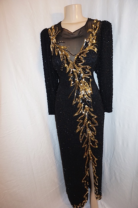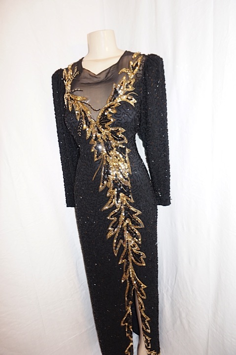 Up for sale is this Vintage Nite Black/Gold L/S Sequins Dress, size M-L. The material is silk and it does have shoulder pads. The measurements are 17" pit to pit, sleeve 20", with overall length 60".