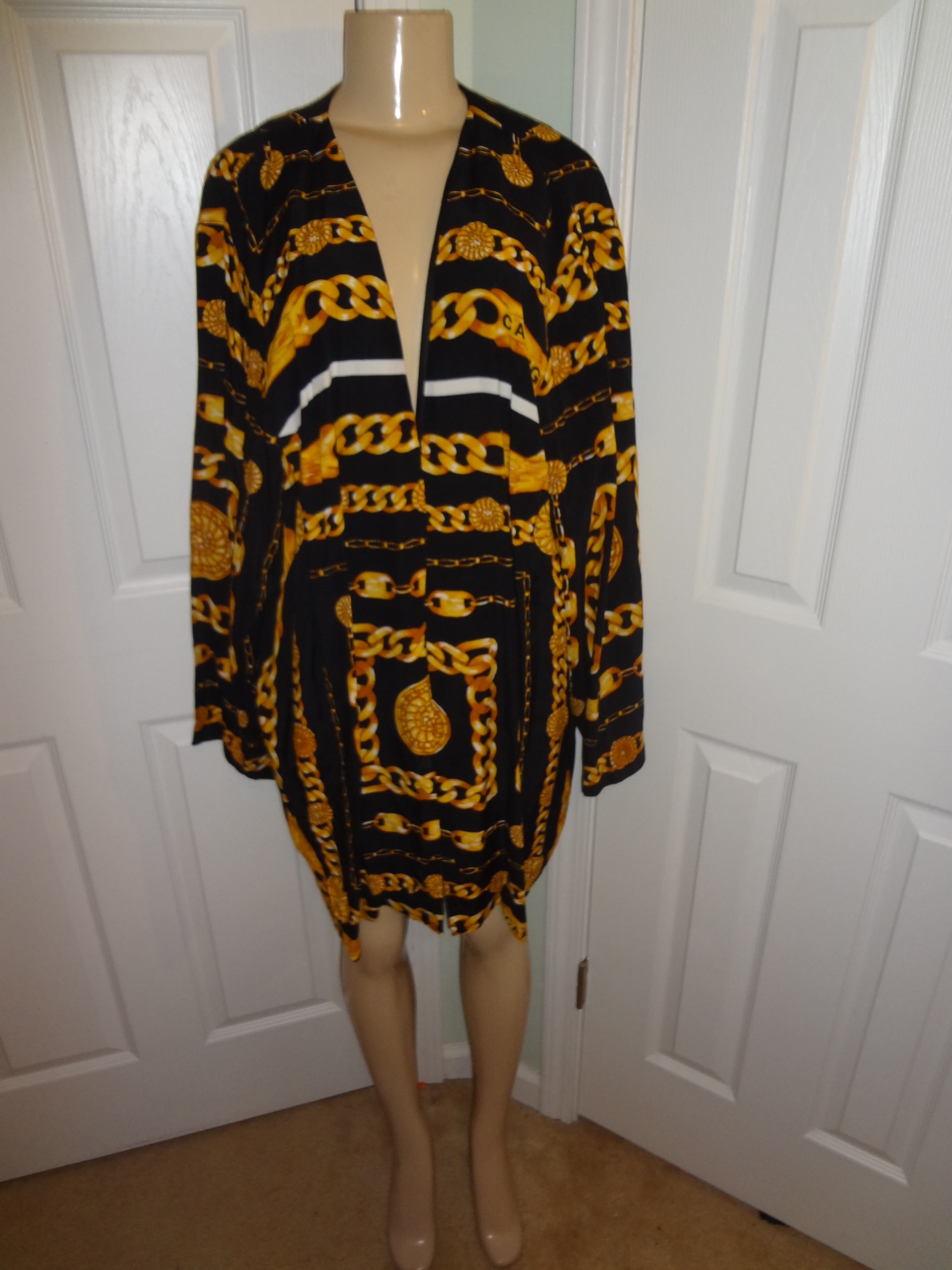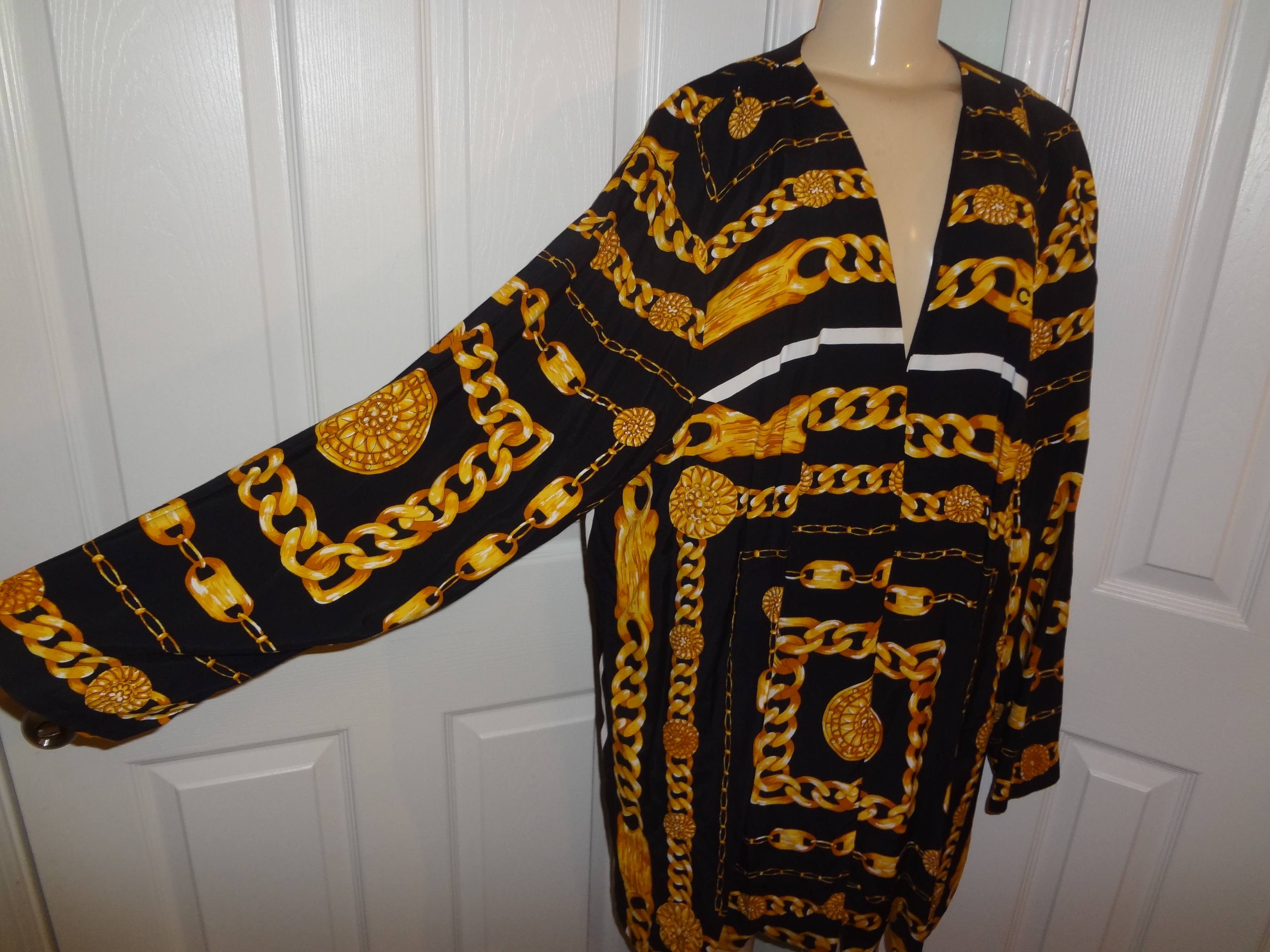 Up for sale is a lovely Vintage KC Spencer Black Chanel Insired throw jacket size 3x. The material is rayon and it do not have shoulder pads. The measurements are pit to pit 27", sleeve 16", and the overall length is 34" long.