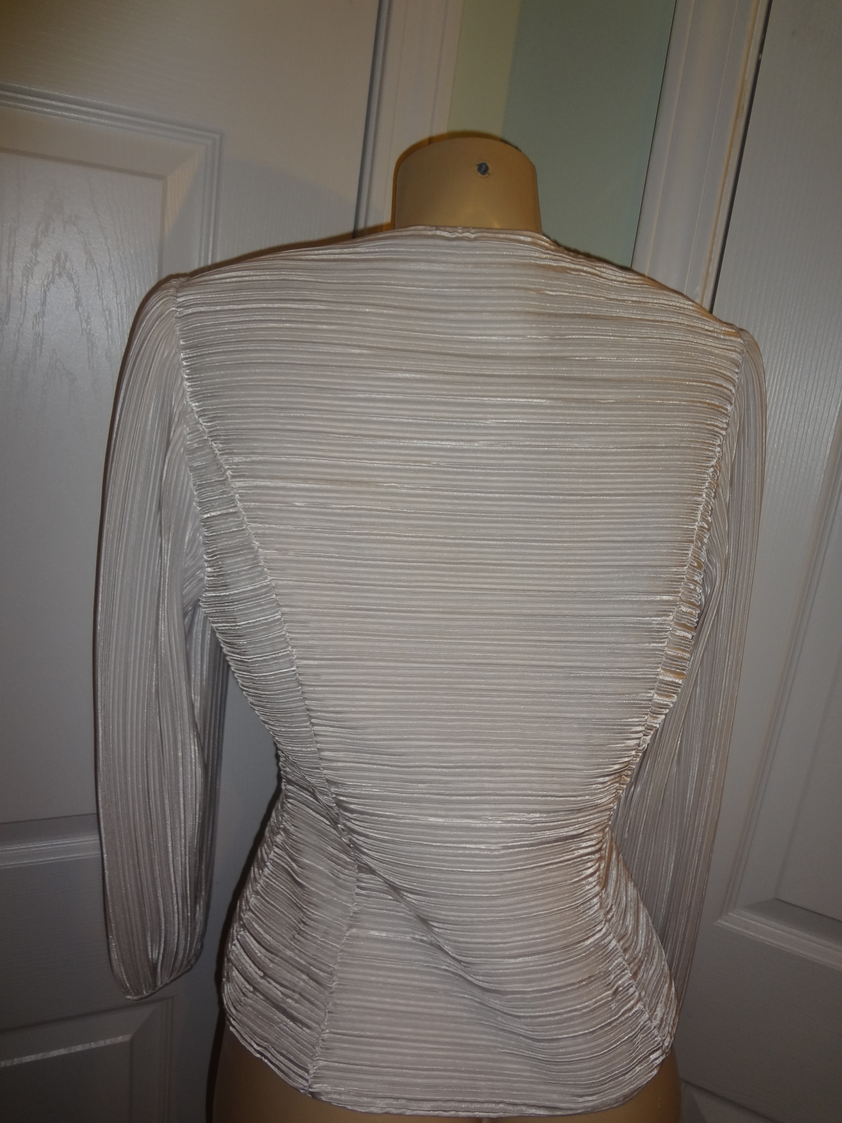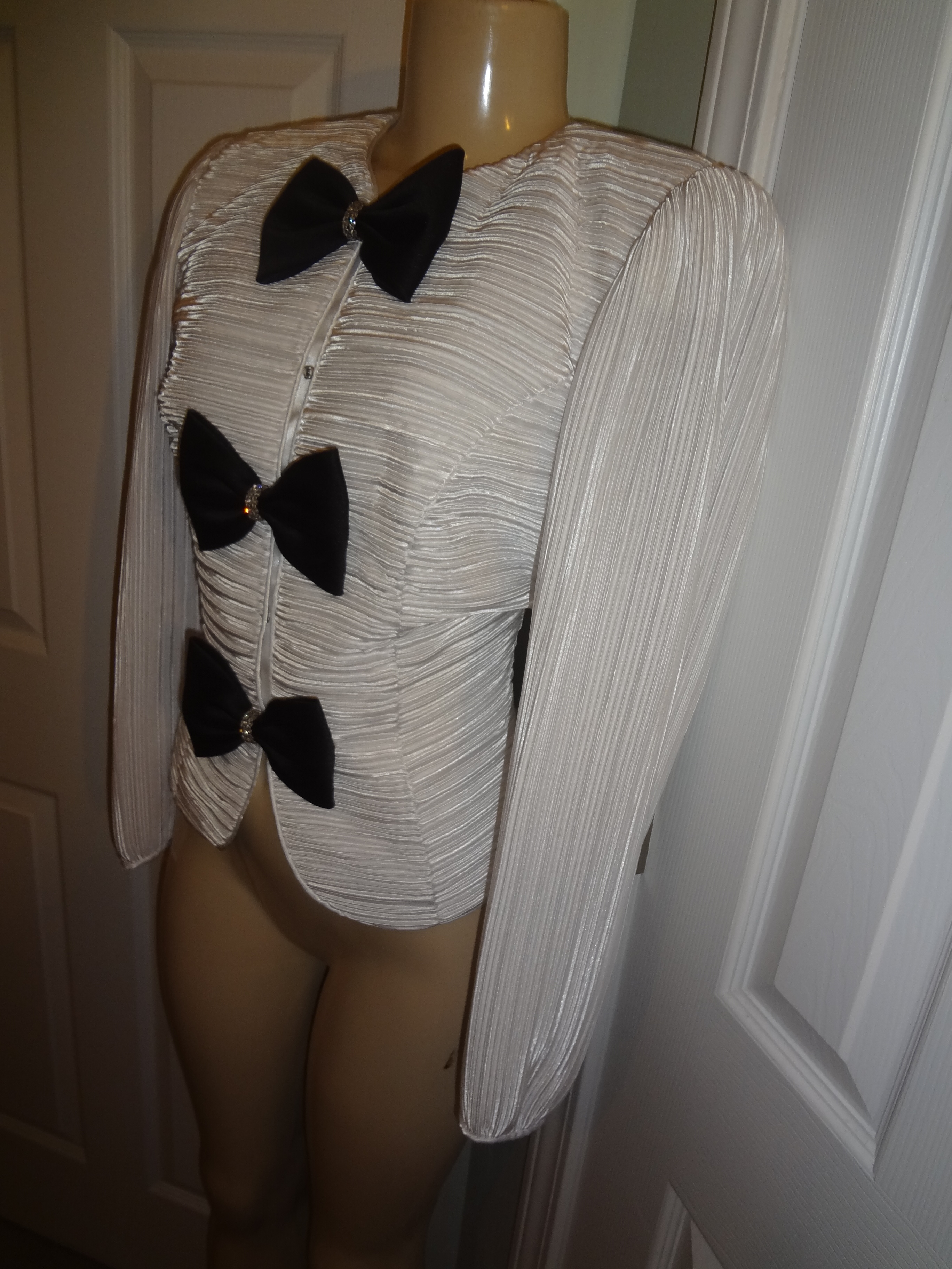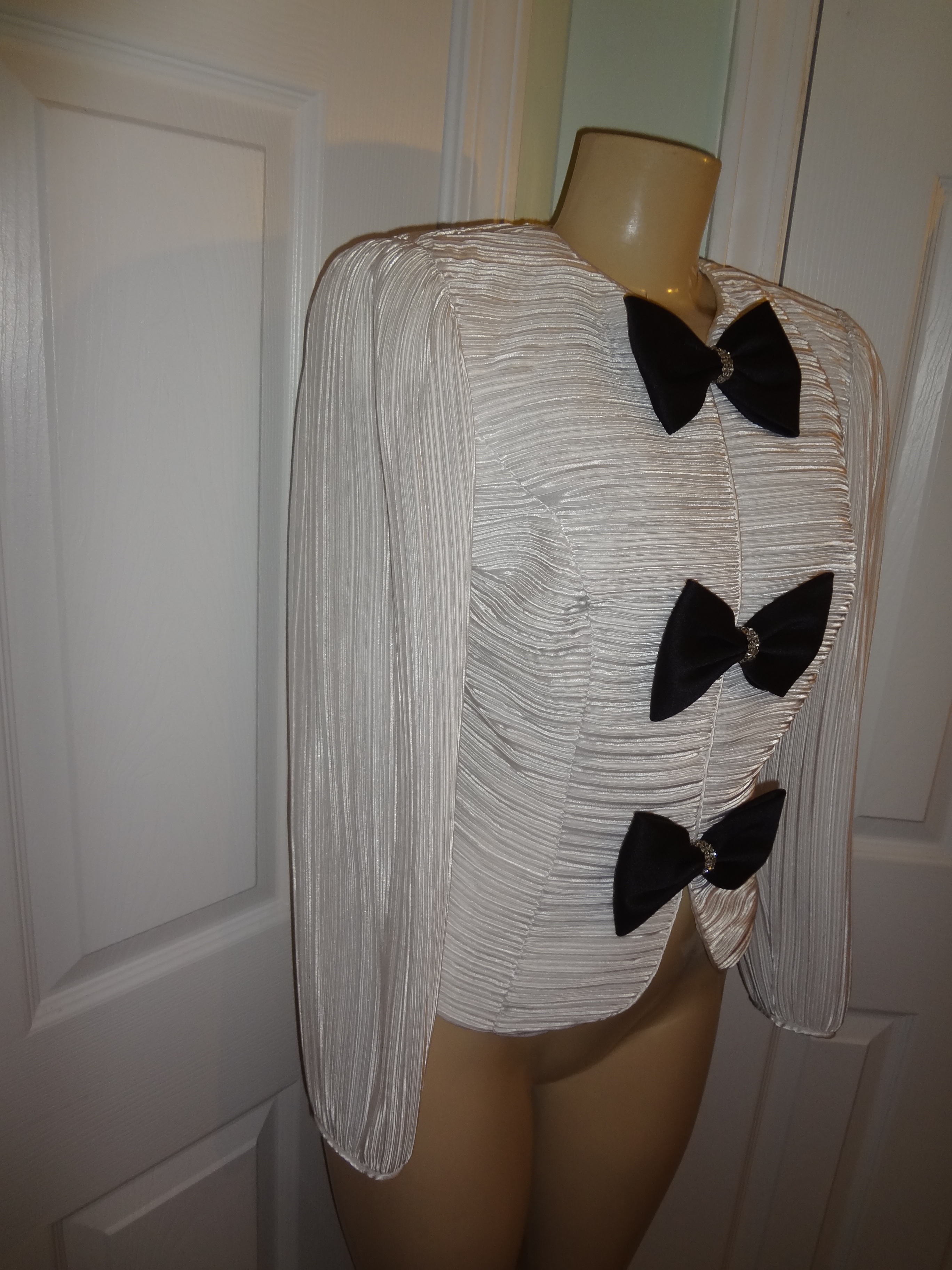Up for sale is as lovely Vintage Leslie White/Black Bow Tie Blouse Size L. I love love this top!! The material is polyester and it do have shoulder pads. The measurements are pit to pit 18" sleeve 16", and the overall length is 23" long.